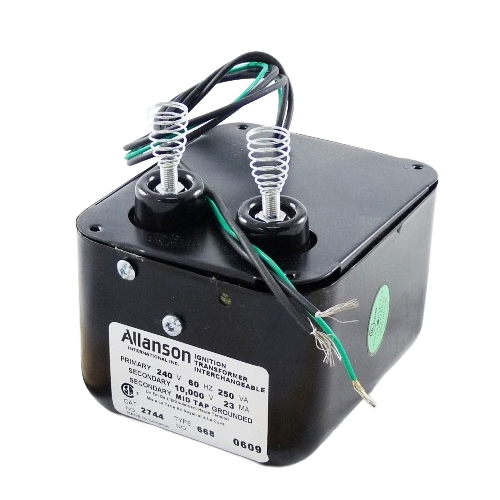 The Allanson 2744-668 is an OEM ferromagnetic ignition transformer engineered to deliver reliable high-voltage spark energy for Wayne oil burner systems and similar HVAC combustion applications. It operates on a 240 VAC primary and steps up to a 10,000 VAC secondary output at ~23 mA (~250 VA), providing consistent ignition performance under constant duty. With high-temperature internal wiring, midpoint grounding, and a robust double-pole ferromagnetic core, this transformer runs cooler, quieter, and meets EMI/RFI noise suppression standards for compliant operation. Engineered to OEM specifications, the 2744-668 ensures long service life and dependable ignition for residential and commercial oil burners.