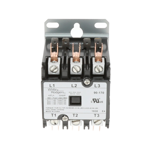 The Copeland 90-170 definite purpose contactor is designed for switching high-current loads in HVAC systems, including compressors and fan motors. This contactor features a 24V coil, making it compatible with standard low-voltage control circuits used in residential and light commercial equipment. Rated for 40 amps, it provides reliable electrical switching for air conditioners, heat pumps, and refrigeration systems. Its compact design supports straightforward installation and replacement in condensing units and control panels.