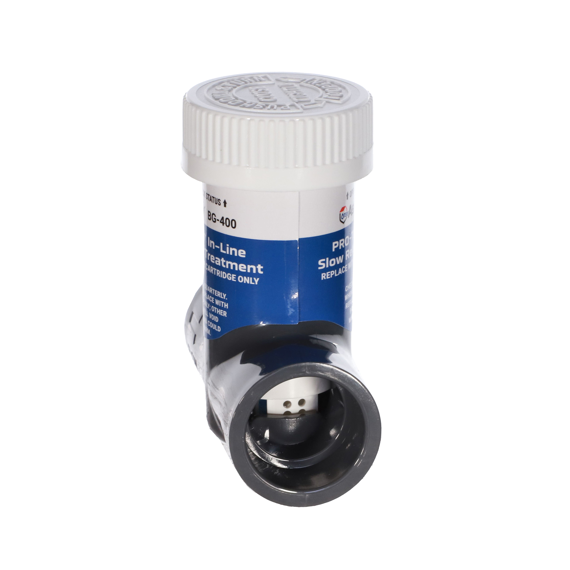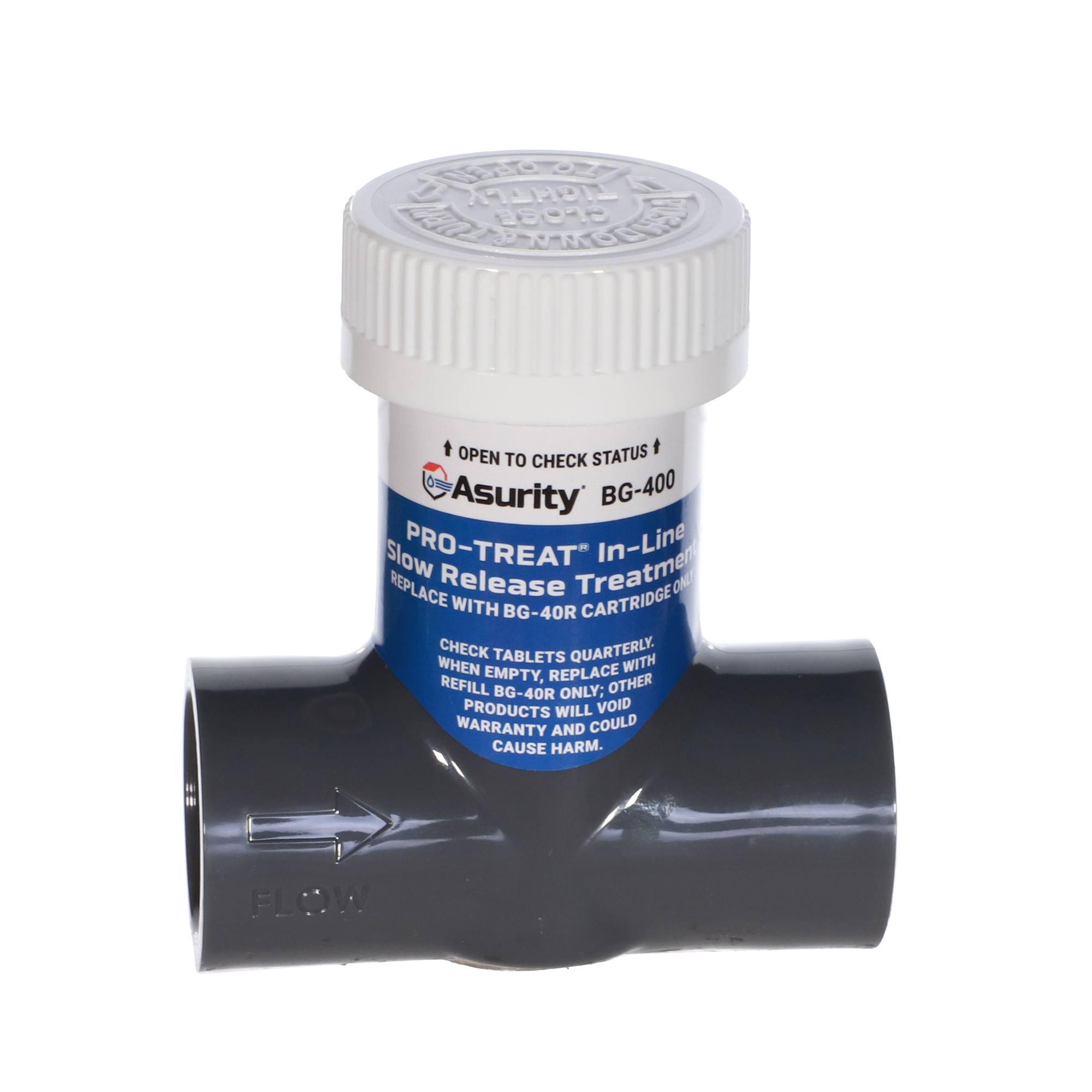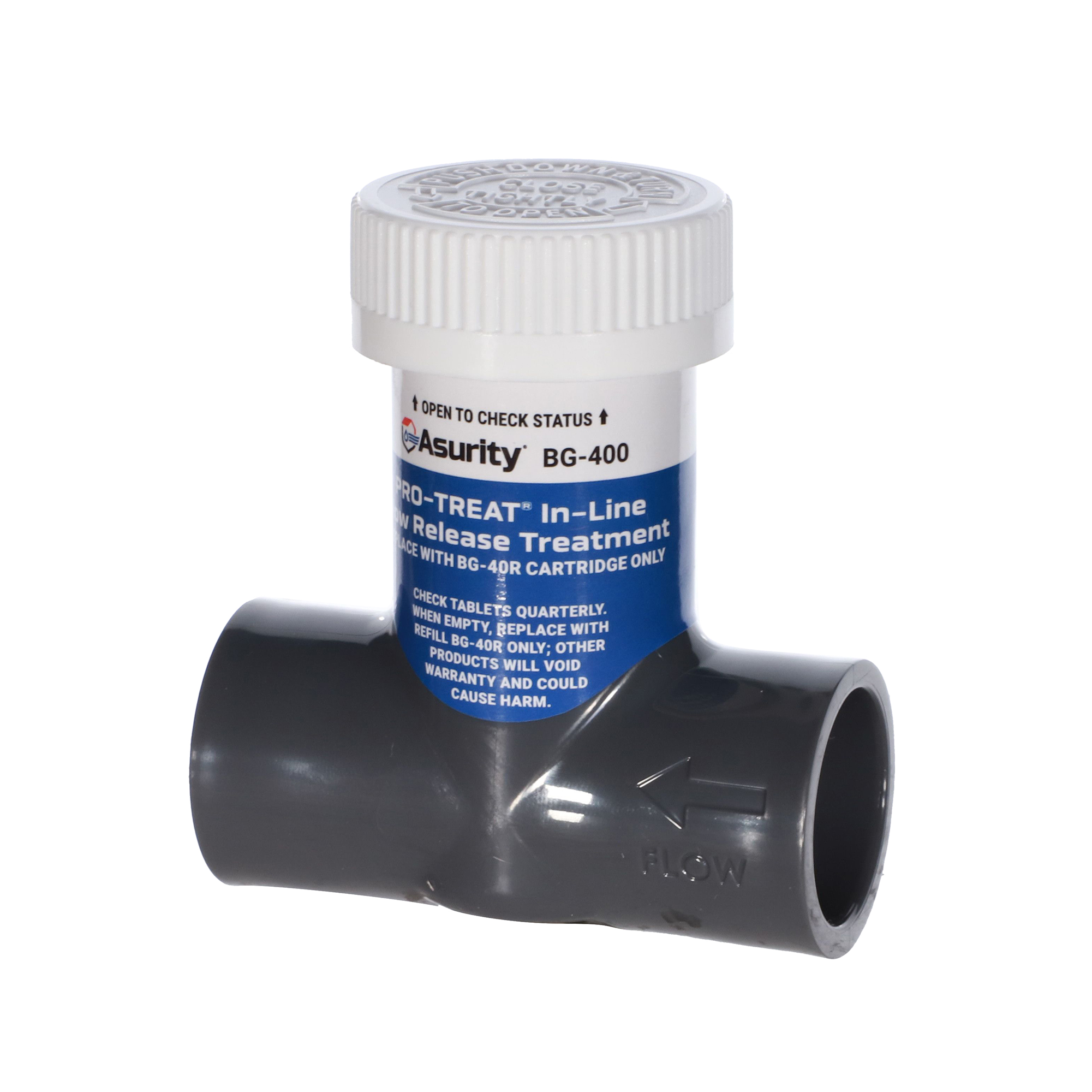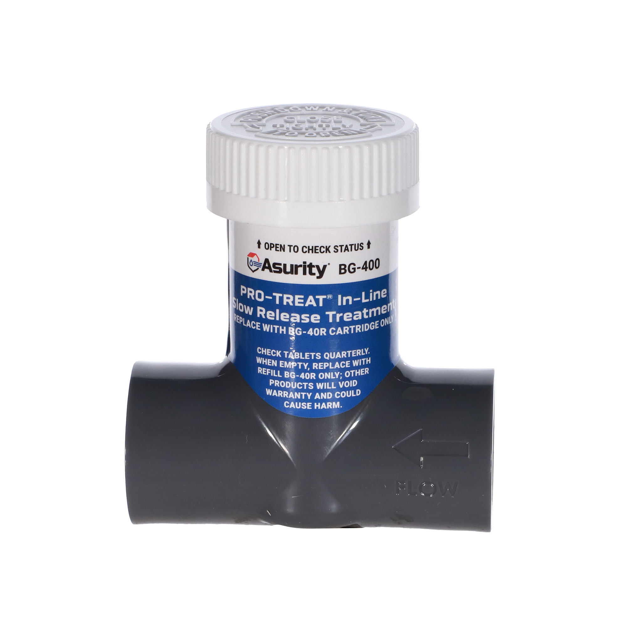 Asurity® BG-400 is an inline, patent-pending auto-dosing treatment delivery system. As the condensate water passes through and over the treatment tablets, the condensate line is constantly dosed with treatment to keep the lines clear and flowing properly,
