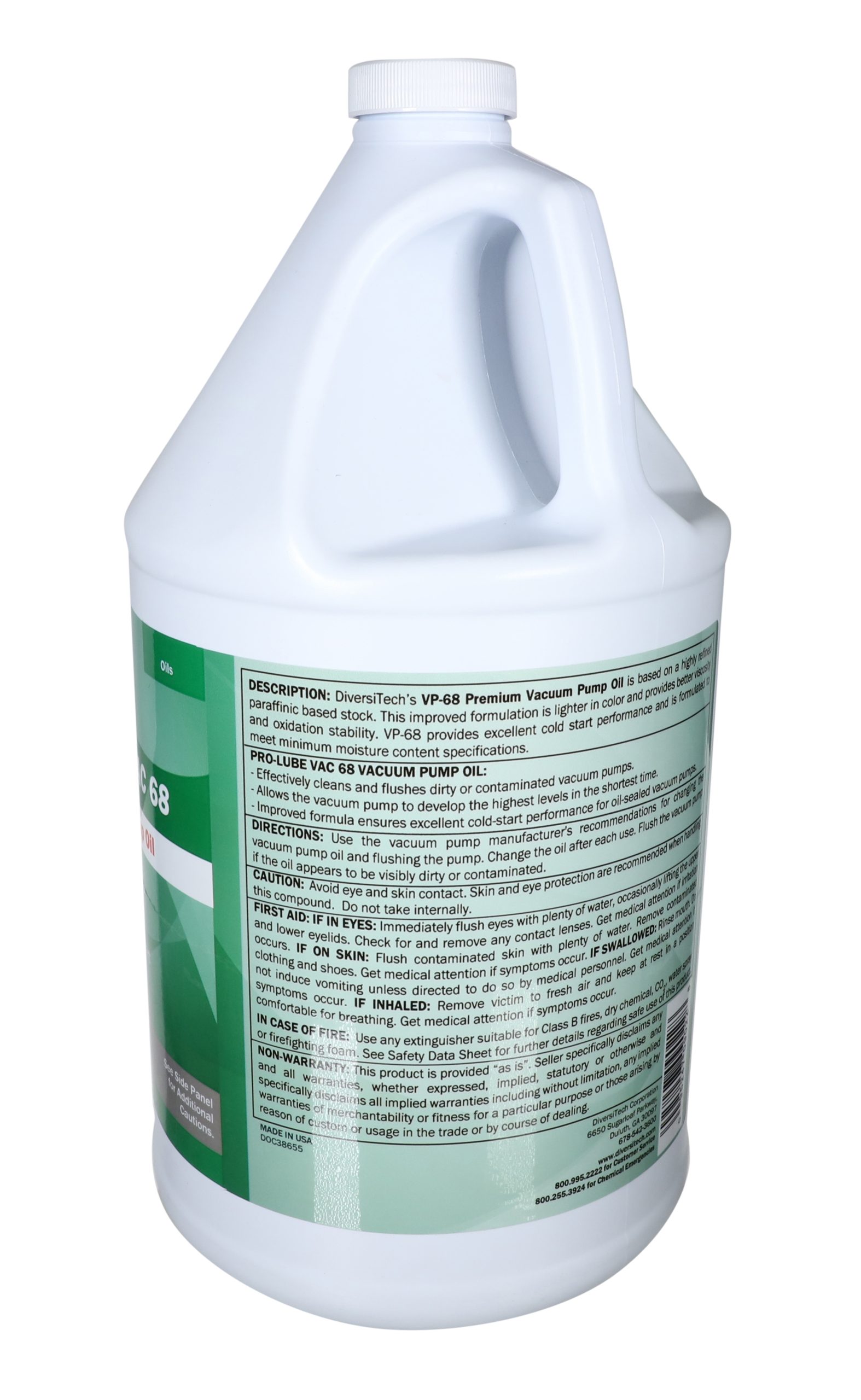 VP-68 Premium Vacuum Pump Oil is now based on a highly refined paraffinic based stock. This new improved formulation is lighter in color and provides better viscosity and oxidation stability than the previous formulation.