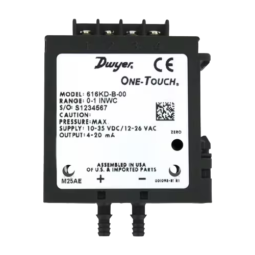 The Dwyer 616KD-00 Differential Pressure Transmitter is a precision instrument designed to measure low-pressure differentials in air and compatible non-combustible gases. Part of the rugged 616KD Series with One-Touch® push-button calibration, this compact transmitter delivers a standard 4-20 mA analog output, making it ideal for building automation, air handling units, duct pressure control, filter monitoring, and other HVAC airflow applications.
