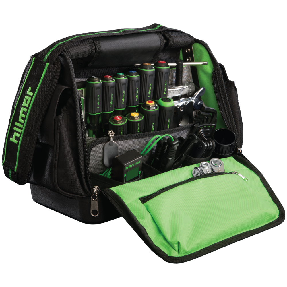 The hilmor Tool Center Bag is your total tool storage solution. It includes 24 exterior and interior pockets and three pouches so you can store your tools safely and find them quickly. Two padded, side pockets provide safe storage for your meter. Its stur