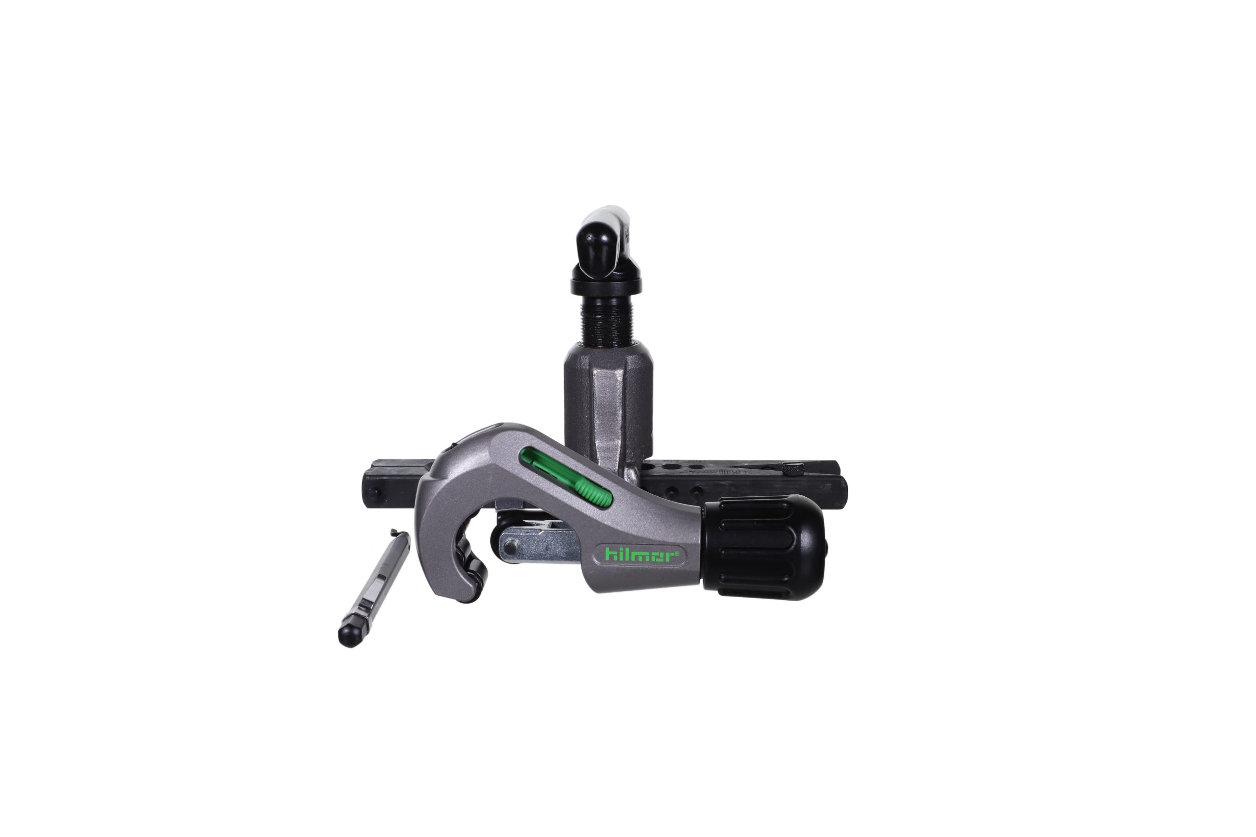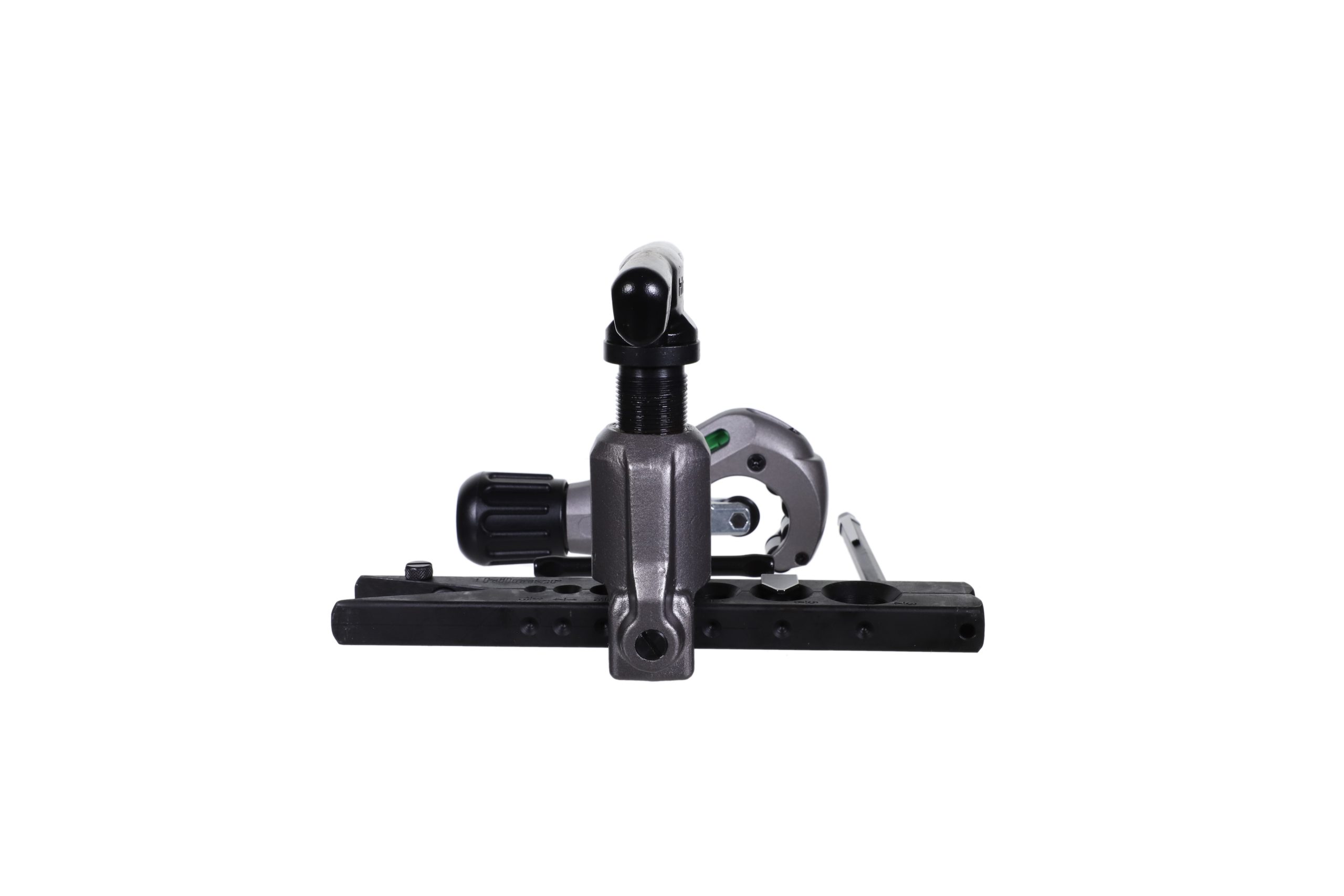 A tube-stop arrow slides to set correct height and positioning, while ball detents allow for easy flaring cone alignment.