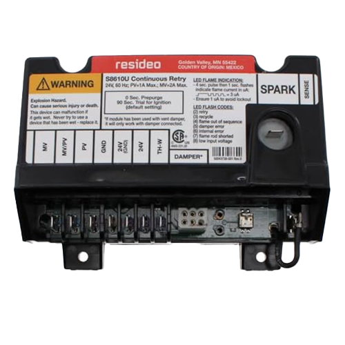 The Honeywell/Resideo S8600H3002 is a proven intermittent pilot ignition control module designed for use with both natural and LP gas systems. It delivers controlled spark ignition, flame detection, and full safety shutoff. With a single ignition trial and 90‑second lockout, it ensures secure operation and requires manual reset upon lockout.