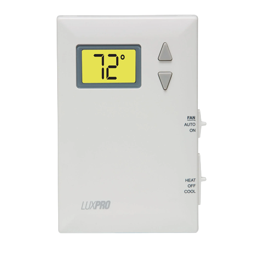 The LUX Products PSD011B-010 is a non-programmable digital thermostat designed for dependable temperature control in residential HVAC systems. Supporting 1 heat and 1 cool configurations, it is compatible with standard gas, oil, and electric systems. This thermostat features a clear digital display and simple controls, allowing for easy manual adjustment without the need for programming. It is ideal for retrofit and replacement applications where straightforward operation and reliability are essential.
