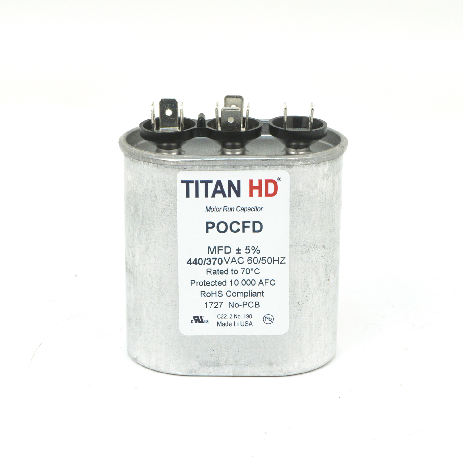 The Packard POCD303A is a Titan HD 30+3 MFD, 370V, Oval Dual Run Capacitor for HVAC motors and compressors. Titan HD capacitors are proudly Made in USA and engineered for professional-grade reliability with a 60,000-hour operating life, meeting the rigorous EIA-456-A industry standard. The patented, environmentally friendly oil prevents corrosion and optimizes heat transfer, while the UL-approved pressure-sensitive interrupter safely removes the capacitor from the circuit at end of life. This dual-rated capacitor houses two capacitance values in a single unit, powering both the compressor and the fan motor simultaneously – simplifying installation and reducing component count.