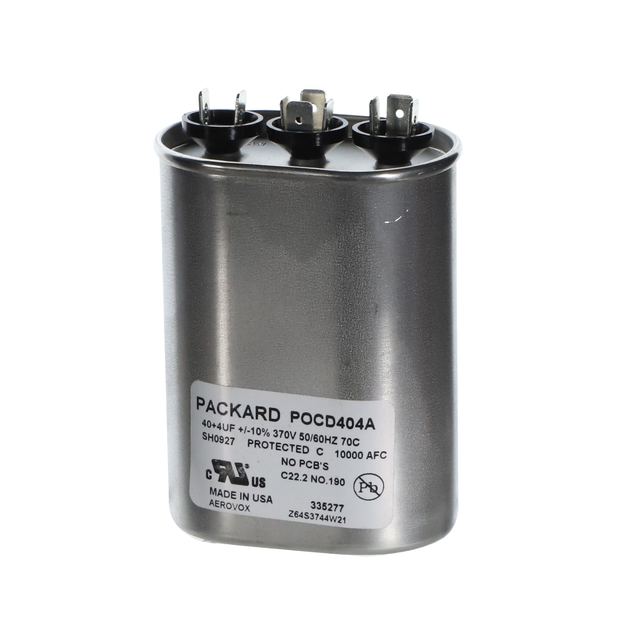 The Packard POCD404A is a Titan HD 40+4 MFD, 370V, Oval Dual Run Capacitor for HVAC motors and compressors. Titan HD capacitors are proudly Made in USA and engineered for professional-grade reliability with a 60,000-hour operating life, meeting the rigorous EIA-456-A industry standard. The patented, environmentally friendly oil prevents corrosion and optimizes heat transfer, while the UL-approved pressure-sensitive interrupter safely removes the capacitor from the circuit at end of life. This dual-rated capacitor houses two capacitance values in a single unit, powering both the compressor and the fan motor simultaneously – simplifying installation and reducing component count.