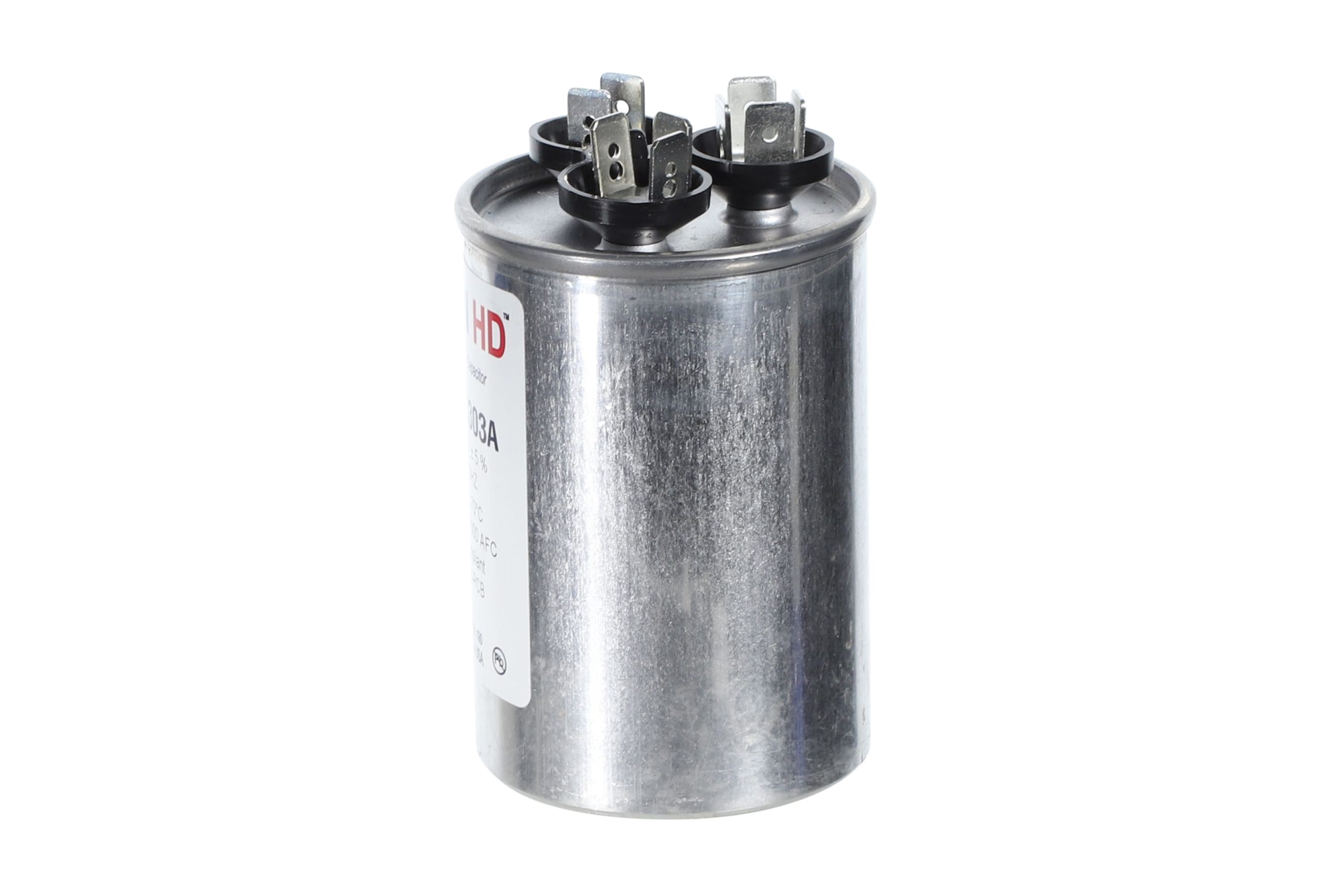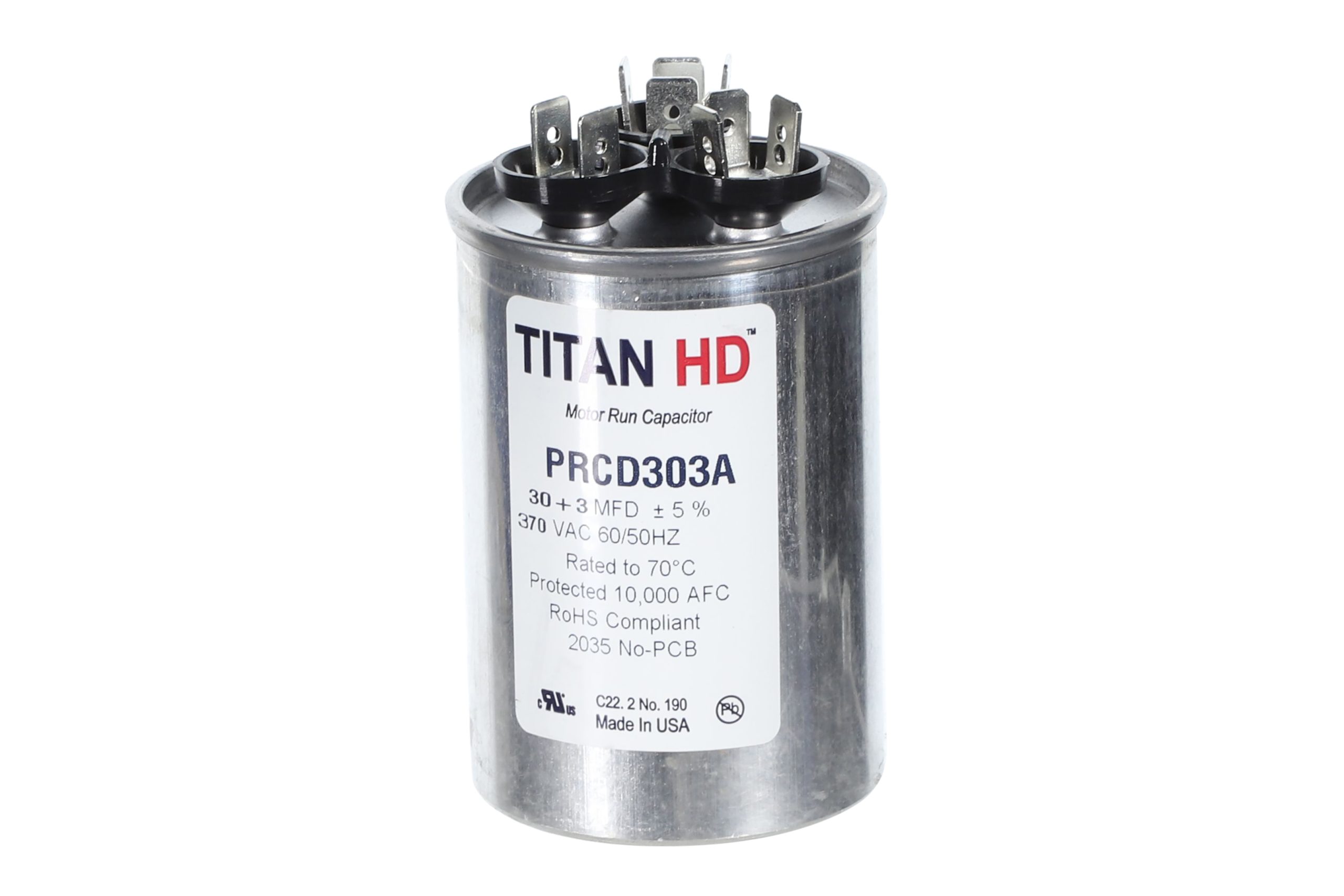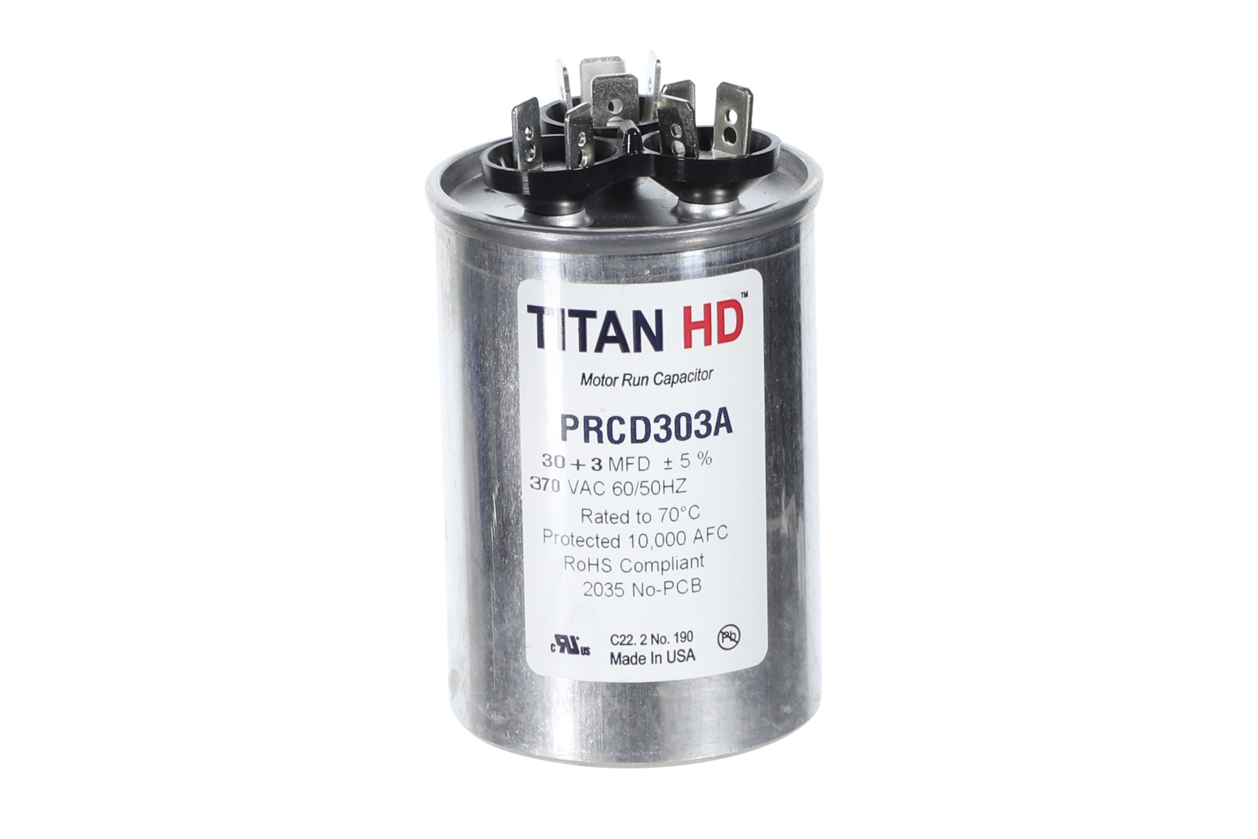 The Packard PRCD303A is a Titan HD 30+3 MFD, 370V, Round Dual Run Capacitor for HVAC motors and compressors. Titan HD capacitors are proudly Made in USA and engineered for professional-grade reliability with a 60,000-hour operating life, meeting the rigorous EIA-456-A industry standard. The patented, environmentally friendly oil prevents corrosion and optimizes heat transfer, while the UL-approved pressure-sensitive interrupter safely removes the capacitor from the circuit at end of life. This dual-rated capacitor houses two capacitance values in a single unit, powering both the compressor and the fan motor simultaneously – simplifying installation and reducing component count.