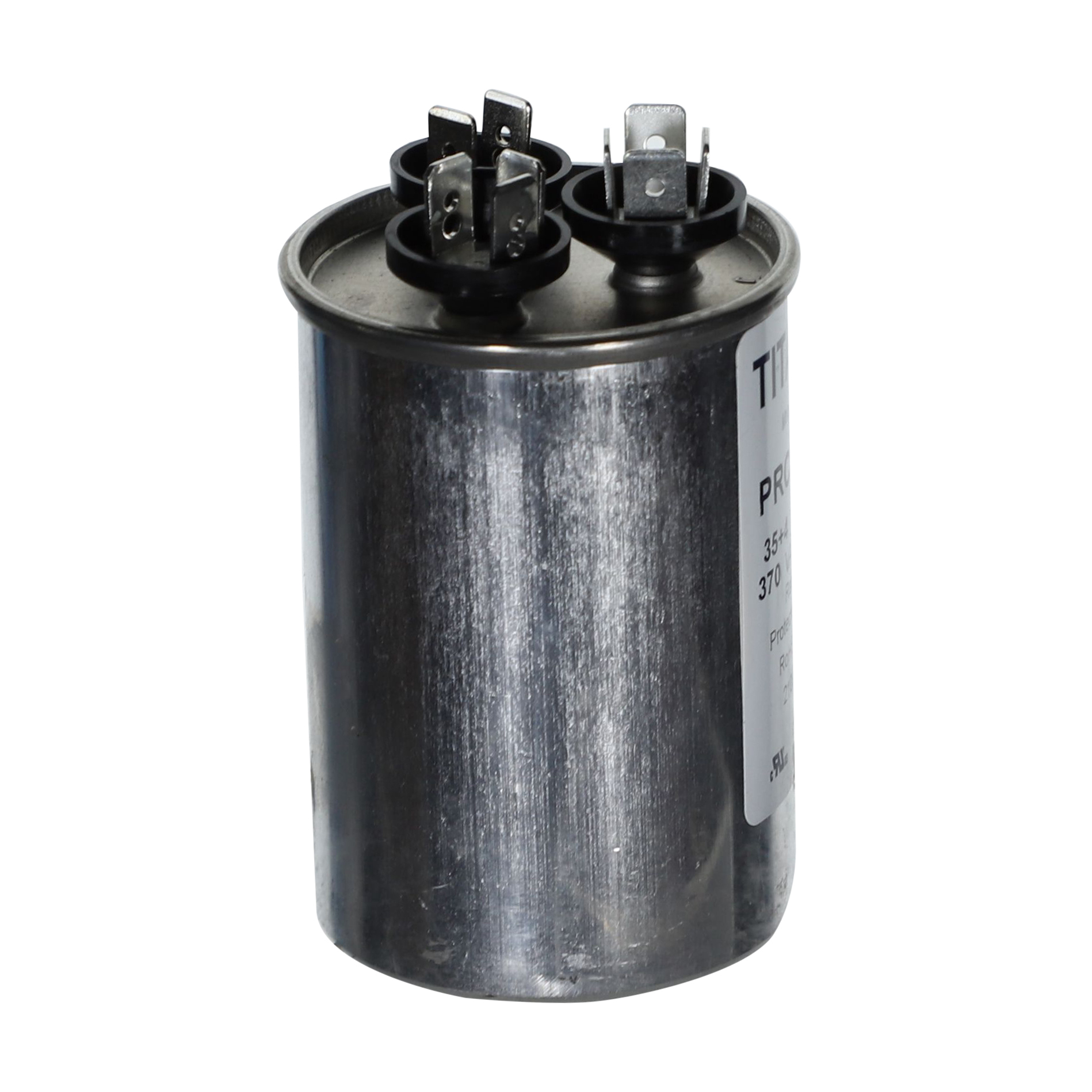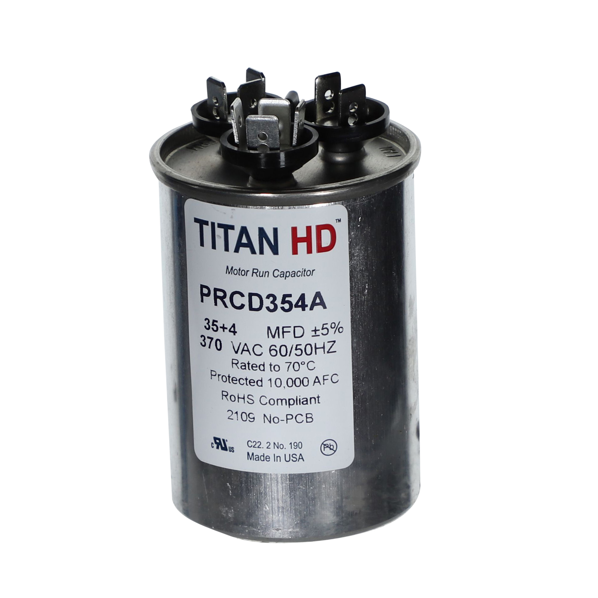 The Packard PRCD354A is a Titan HD 35+4 MFD, 370V, Round Dual Run Capacitor for HVAC motors and compressors. Titan HD capacitors are proudly Made in USA and engineered for professional-grade reliability with a 60,000-hour operating life, meeting the rigorous EIA-456-A industry standard. The patented, environmentally friendly oil prevents corrosion and optimizes heat transfer, while the UL-approved pressure-sensitive interrupter safely removes the capacitor from the circuit at end of life. This dual-rated capacitor houses two capacitance values in a single unit, powering both the compressor and the fan motor simultaneously – simplifying installation and reducing component count.