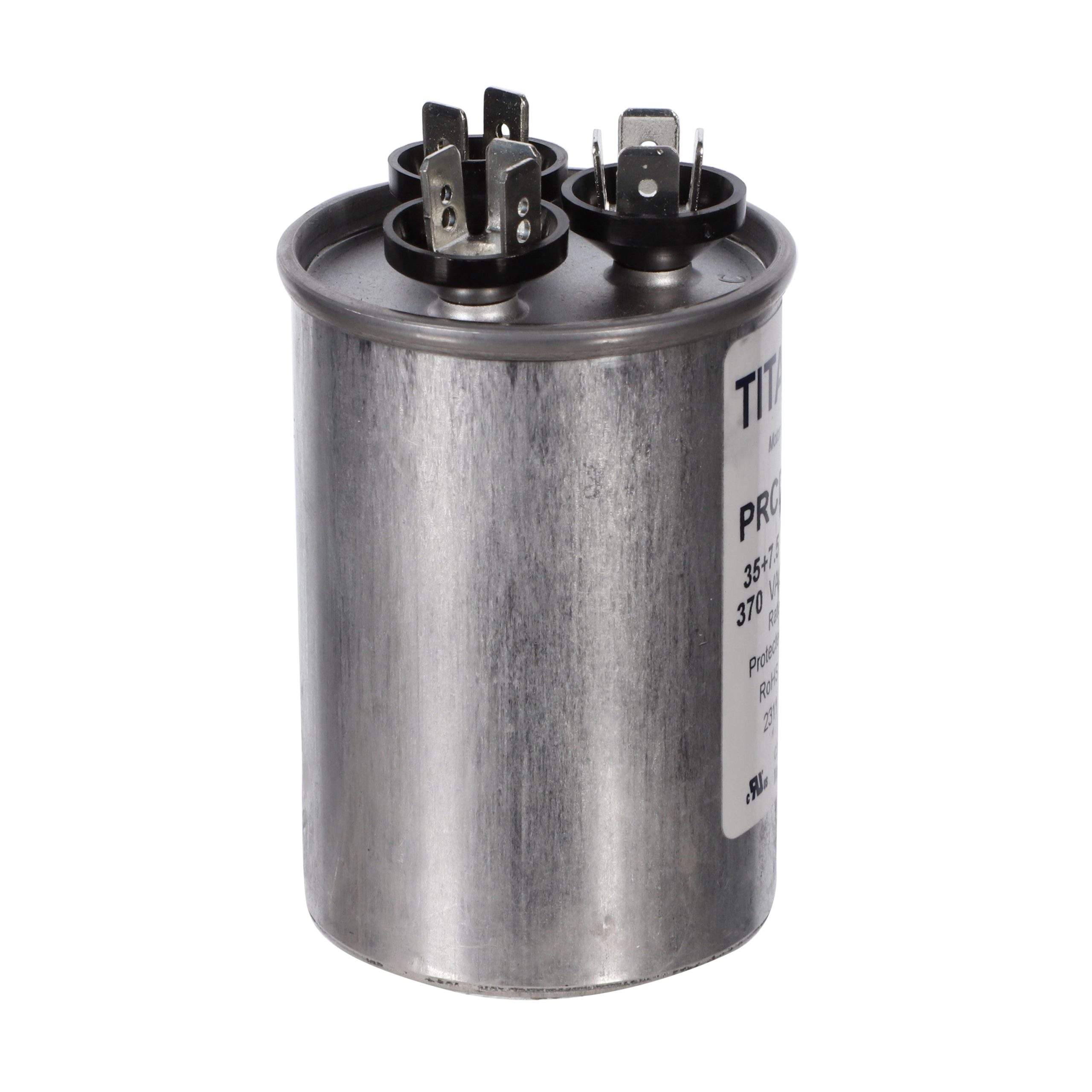 The Packard PRCD3575A is a Titan HD 35+7.5 MFD, 370V, Round Dual Run Capacitor for HVAC motors and compressors. Titan HD capacitors are proudly Made in USA and engineered for professional-grade reliability with a 60,000-hour operating life, meeting the rigorous EIA-456-A industry standard. The patented, environmentally friendly oil prevents corrosion and optimizes heat transfer, while the UL-approved pressure-sensitive interrupter safely removes the capacitor from the circuit at end of life. This dual-rated capacitor houses two capacitance values in a single unit, powering both the compressor and the fan motor simultaneously – simplifying installation and reducing component count.