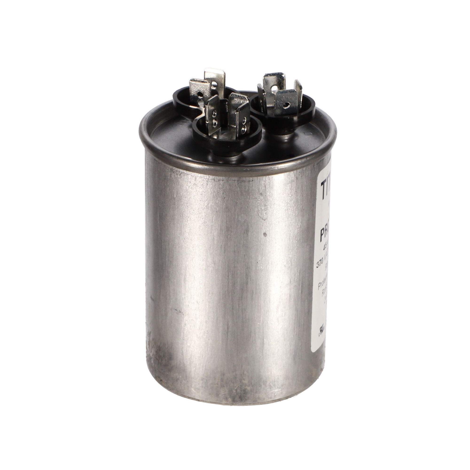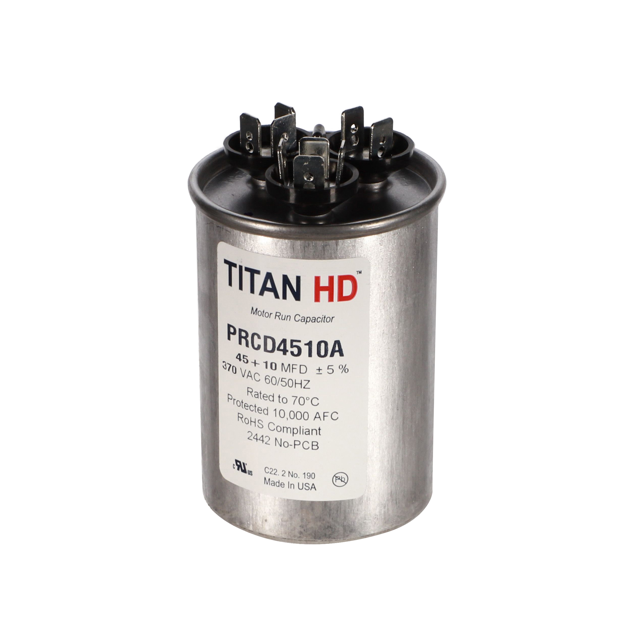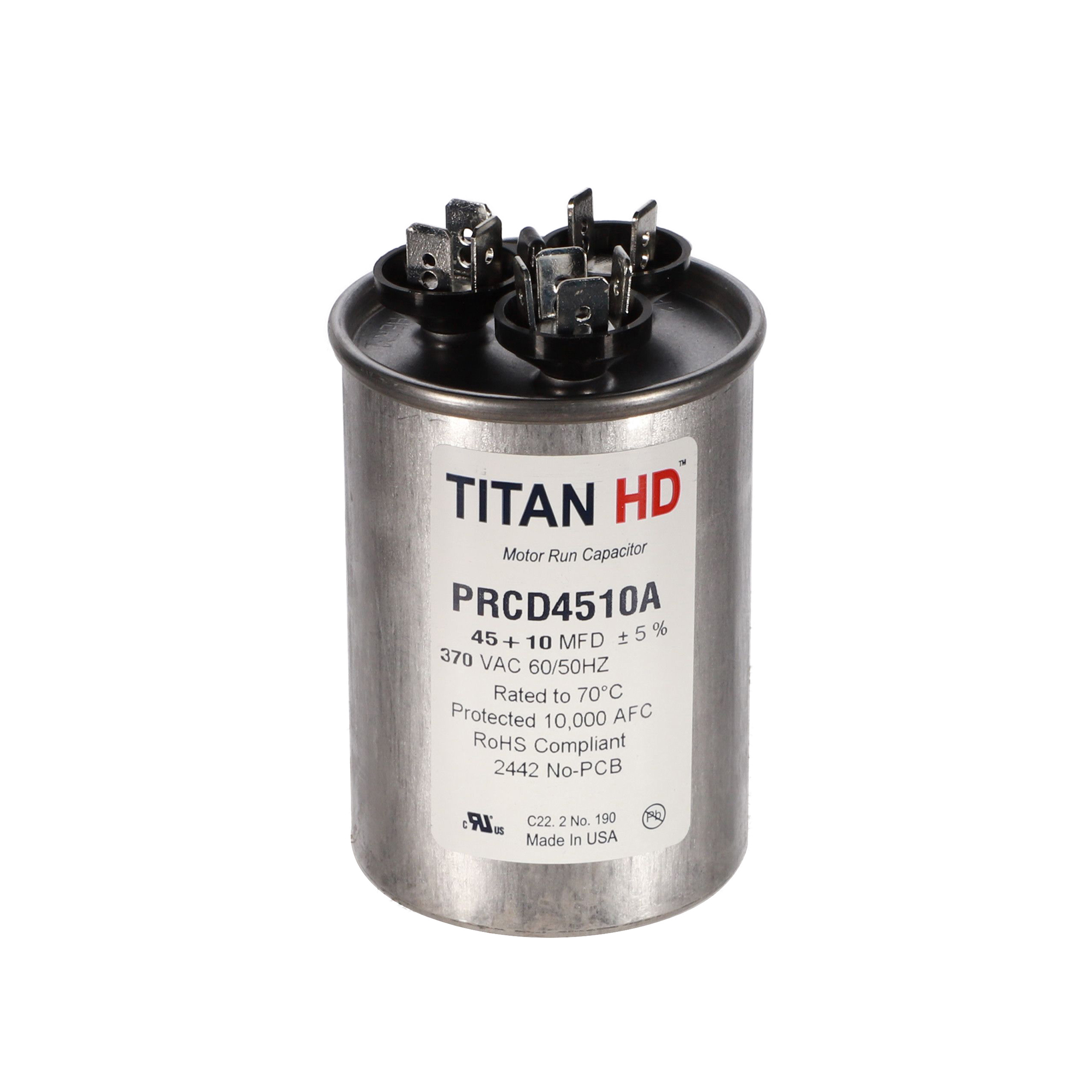 The Packard PRCD4510A is a Titan HD 45+10 MFD, 370V, Round Dual Run Capacitor for HVAC motors and compressors. Titan HD capacitors are proudly Made in USA and engineered for professional-grade reliability with a 60,000-hour operating life, meeting the rigorous EIA-456-A industry standard. The patented, environmentally friendly oil prevents corrosion and optimizes heat transfer, while the UL-approved pressure-sensitive interrupter safely removes the capacitor from the circuit at end of life. This dual-rated capacitor houses two capacitance values in a single unit, powering both the compressor and the fan motor simultaneously – simplifying installation and reducing component count.