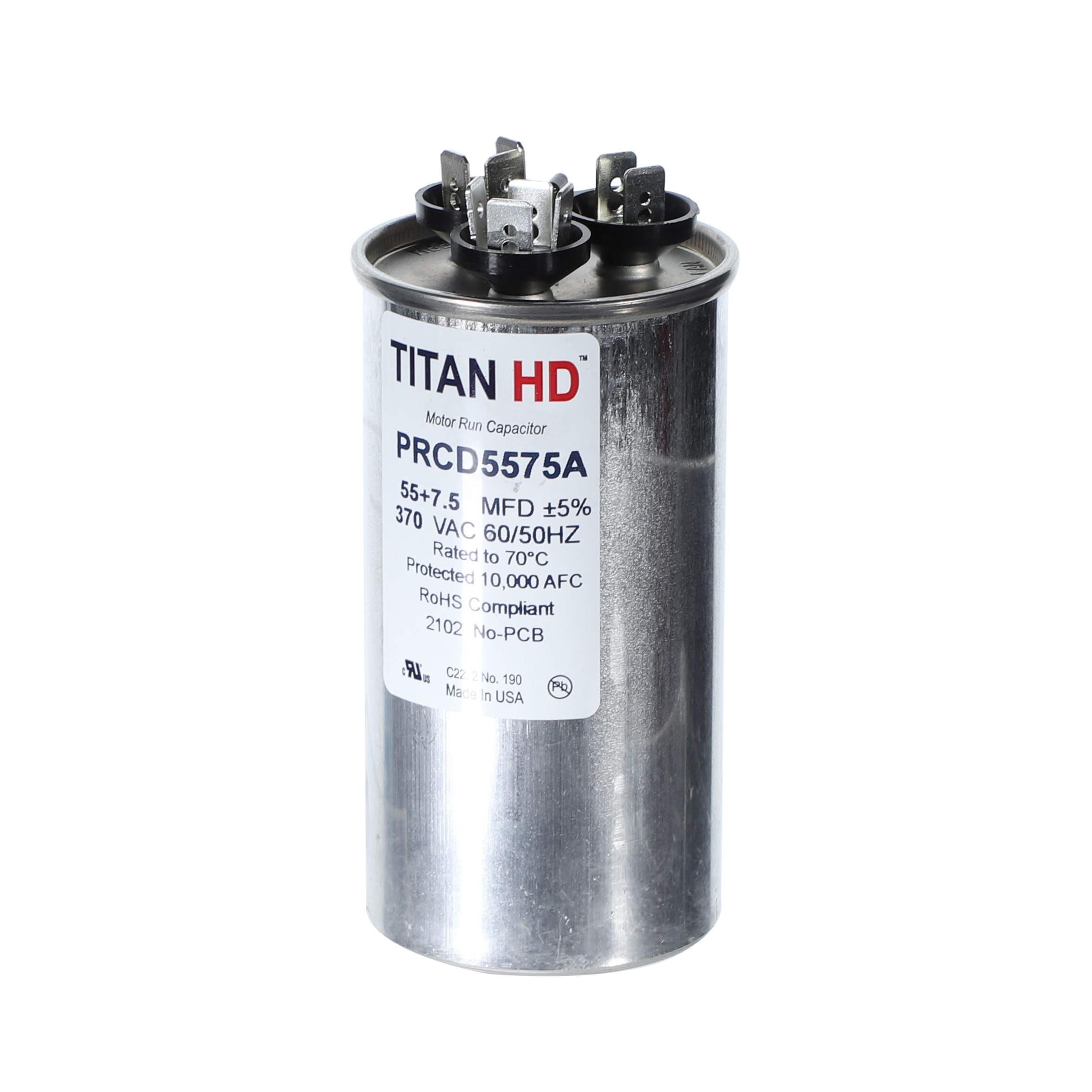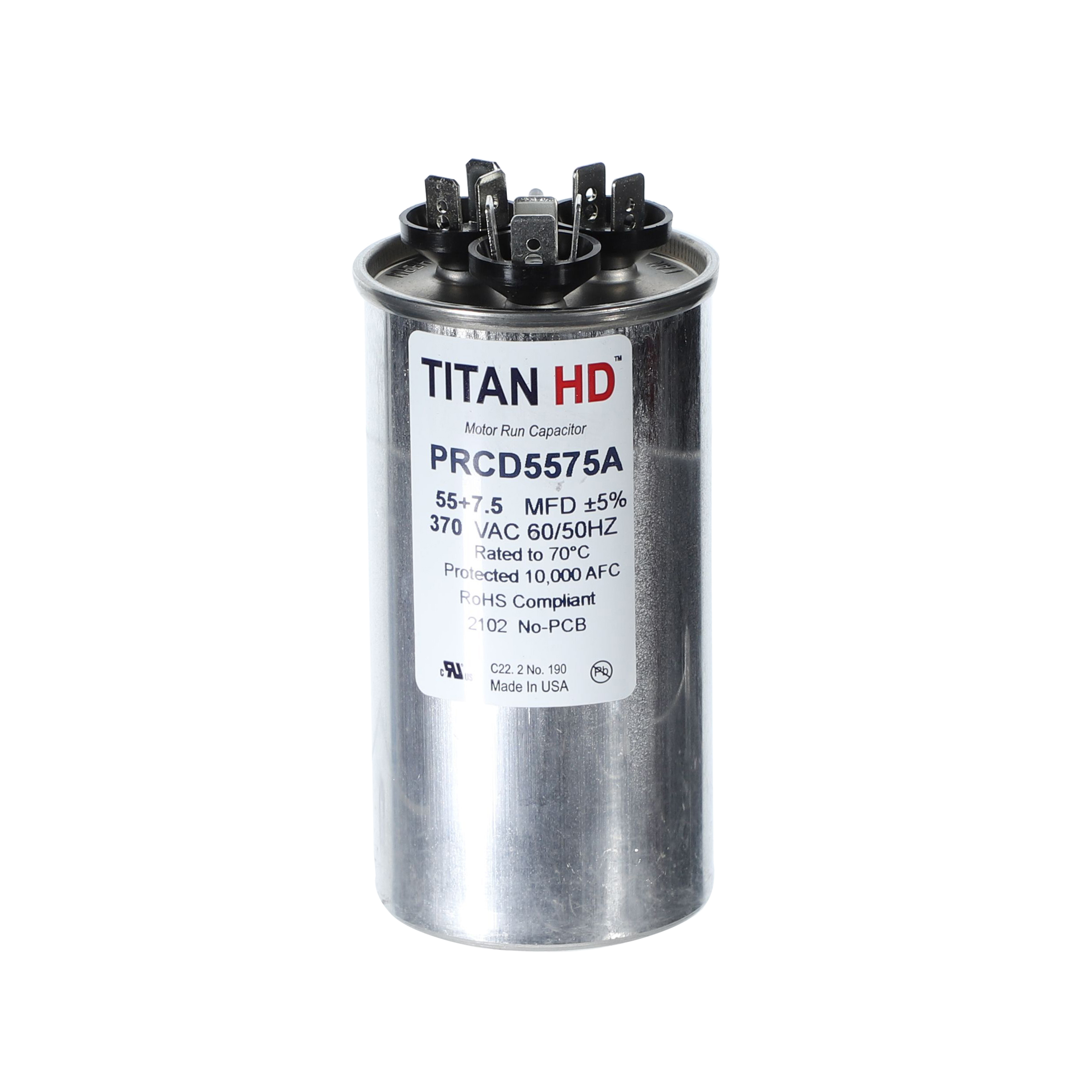 The Packard PRCD5575A is a Titan HD 55+7.5 MFD, 370V, Round Dual Run Capacitor for HVAC motors and compressors. Titan HD capacitors are proudly Made in USA and engineered for professional-grade reliability with a 60,000-hour operating life, meeting the rigorous EIA-456-A industry standard. The patented, environmentally friendly oil prevents corrosion and optimizes heat transfer, while the UL-approved pressure-sensitive interrupter safely removes the capacitor from the circuit at end of life. This dual-rated capacitor houses two capacitance values in a single unit, powering both the compressor and the fan motor simultaneously – simplifying installation and reducing component count.