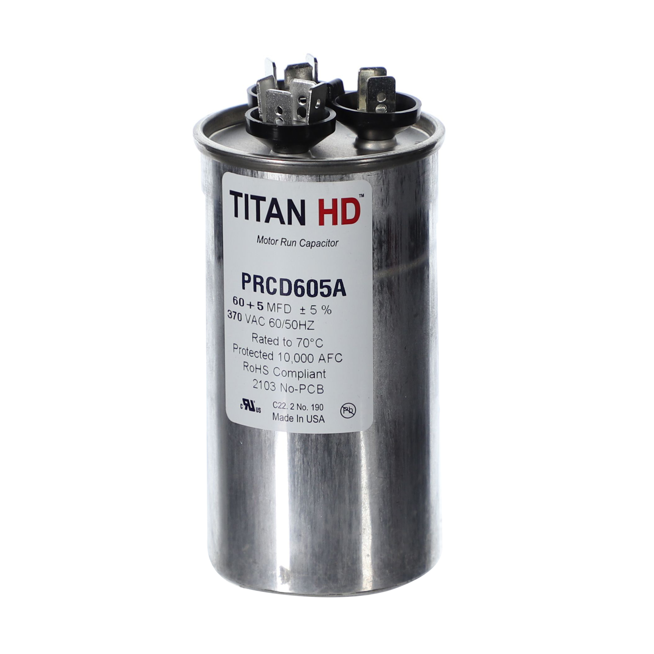 The Packard PRCD605A is a Titan HD 60+5 MFD, 370V, Round Dual Run Capacitor for HVAC motors and compressors. Titan HD capacitors are proudly Made in USA and engineered for professional-grade reliability with a 60,000-hour operating life, meeting the rigorous EIA-456-A industry standard. The patented, environmentally friendly oil prevents corrosion and optimizes heat transfer, while the UL-approved pressure-sensitive interrupter safely removes the capacitor from the circuit at end of life. This dual-rated capacitor houses two capacitance values in a single unit, powering both the compressor and the fan motor simultaneously – simplifying installation and reducing component count.