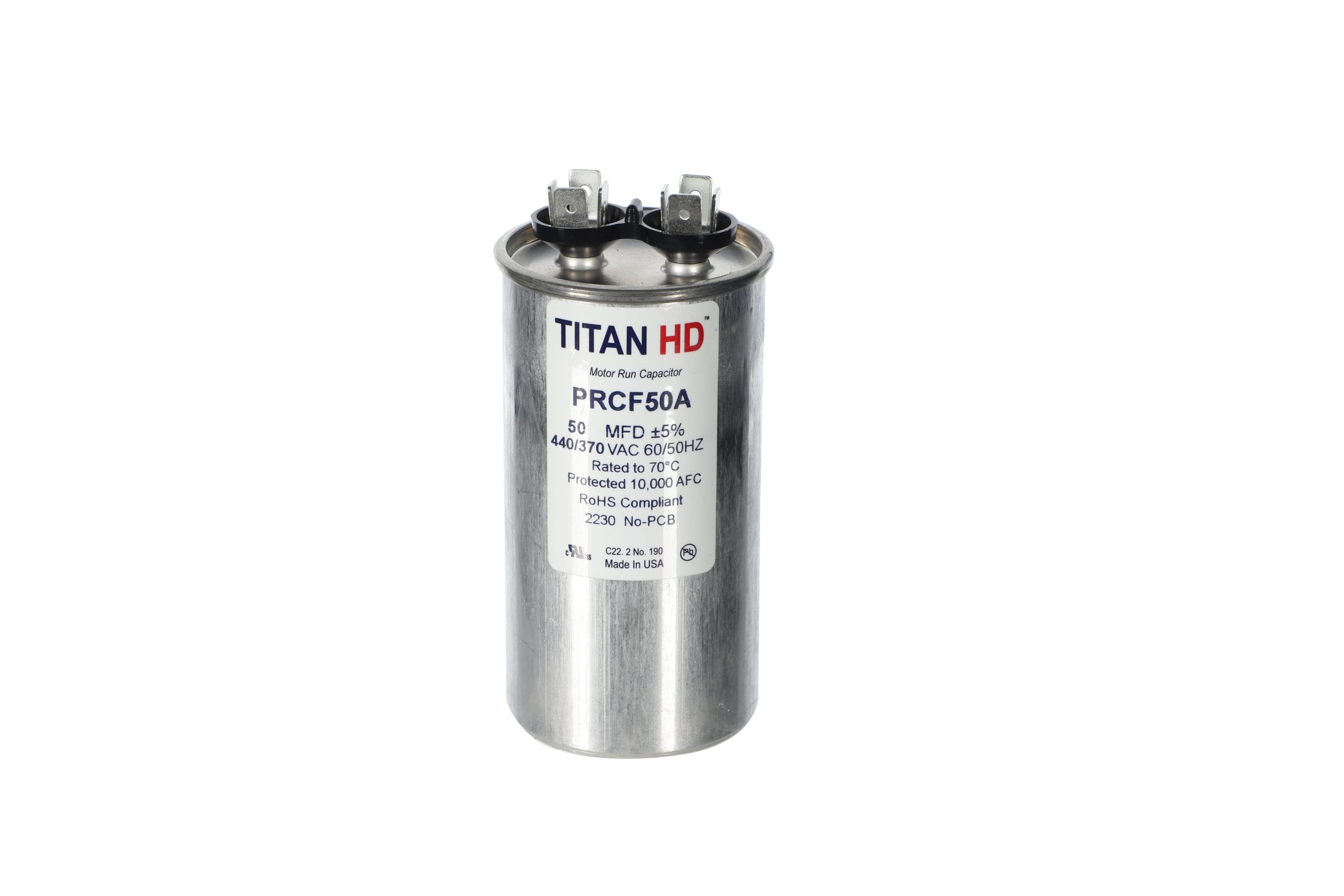 The Packard PRCF50A is a Titan HD 50 MFD, 440/370V, Round Single Run Capacitor for HVAC motors and compressors. Titan HD capacitors are proudly Made in USA and engineered for professional-grade reliability with a 60,000-hour operating life, meeting the rigorous EIA-456-A industry standard. The patented, environmentally friendly oil prevents corrosion and optimizes heat transfer, while the UL-approved pressure-sensitive interrupter safely removes the capacitor from the circuit at end of life. The dual-voltage rating (440/370V) allows this capacitor to replace both 370V and 440V units.