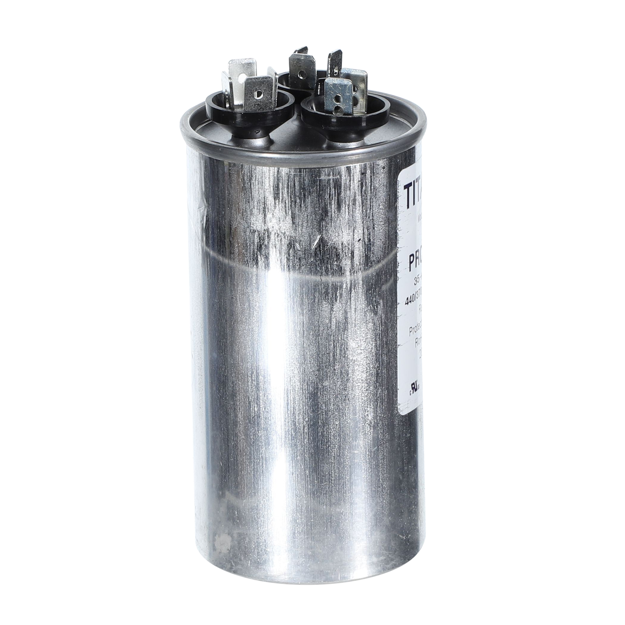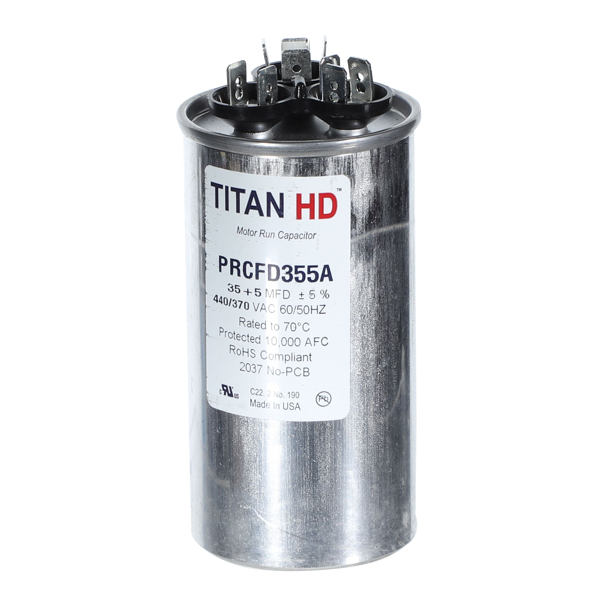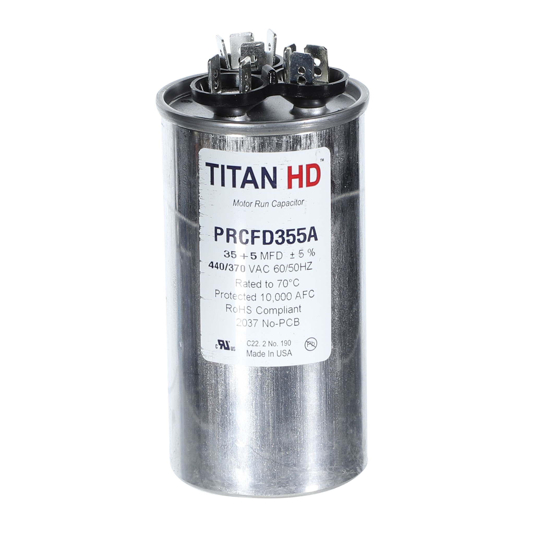The Packard PRCFD353A is a Titan HD 35+3 MFD, 440/370V, Round Dual Run Capacitor for HVAC motors and compressors. Titan HD capacitors are proudly Made in USA and engineered for professional-grade reliability with a 60,000-hour operating life, meeting the rigorous EIA-456-A industry standard. The patented, environmentally friendly oil prevents corrosion and optimizes heat transfer, while the UL-approved pressure-sensitive interrupter safely removes the capacitor from the circuit at end of life. This dual-rated capacitor houses two capacitance values in a single unit, powering both the compressor and the fan motor simultaneously – simplifying installation and reducing component count. The dual-voltage rating (440/370V) allows this capacitor to replace both 370V and 440V units.