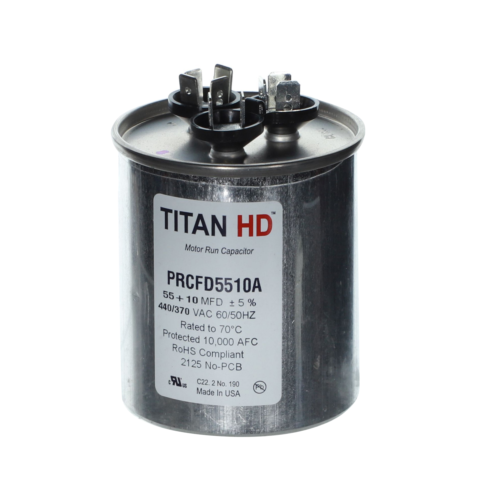 The Packard PRCFD5510A is a Titan HD 55+10 MFD, 440/370V, Round Dual Run Capacitor for HVAC motors and compressors. Titan HD capacitors are proudly Made in USA and engineered for professional-grade reliability with a 60,000-hour operating life, meeting the rigorous EIA-456-A industry standard. The patented, environmentally friendly oil prevents corrosion and optimizes heat transfer, while the UL-approved pressure-sensitive interrupter safely removes the capacitor from the circuit at end of life. This dual-rated capacitor houses two capacitance values in a single unit, powering both the compressor and the fan motor simultaneously – simplifying installation and reducing component count. The dual-voltage rating (440/370V) allows this capacitor to replace both 370V and 440V units.