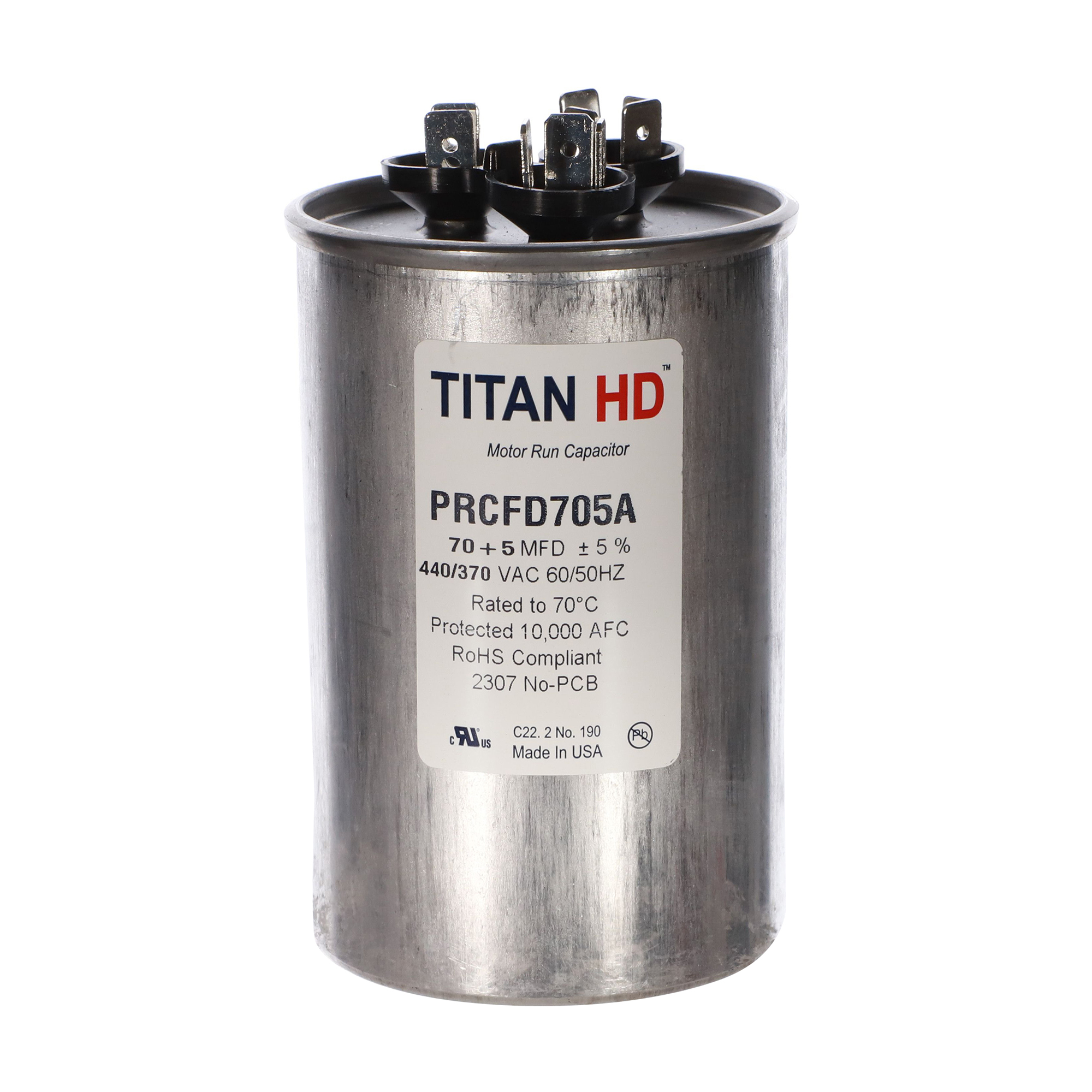The Packard PRCFD705A is a Titan HD 70+5 MFD, 440/370V, Round Dual Run Capacitor for HVAC motors and compressors. Titan HD capacitors are proudly Made in USA and engineered for professional-grade reliability with a 60,000-hour operating life, meeting the rigorous EIA-456-A industry standard. The patented, environmentally friendly oil prevents corrosion and optimizes heat transfer, while the UL-approved pressure-sensitive interrupter safely removes the capacitor from the circuit at end of life. This dual-rated capacitor houses two capacitance values in a single unit, powering both the compressor and the fan motor simultaneously – simplifying installation and reducing component count. The dual-voltage rating (440/370V) allows this capacitor to replace both 370V and 440V units.