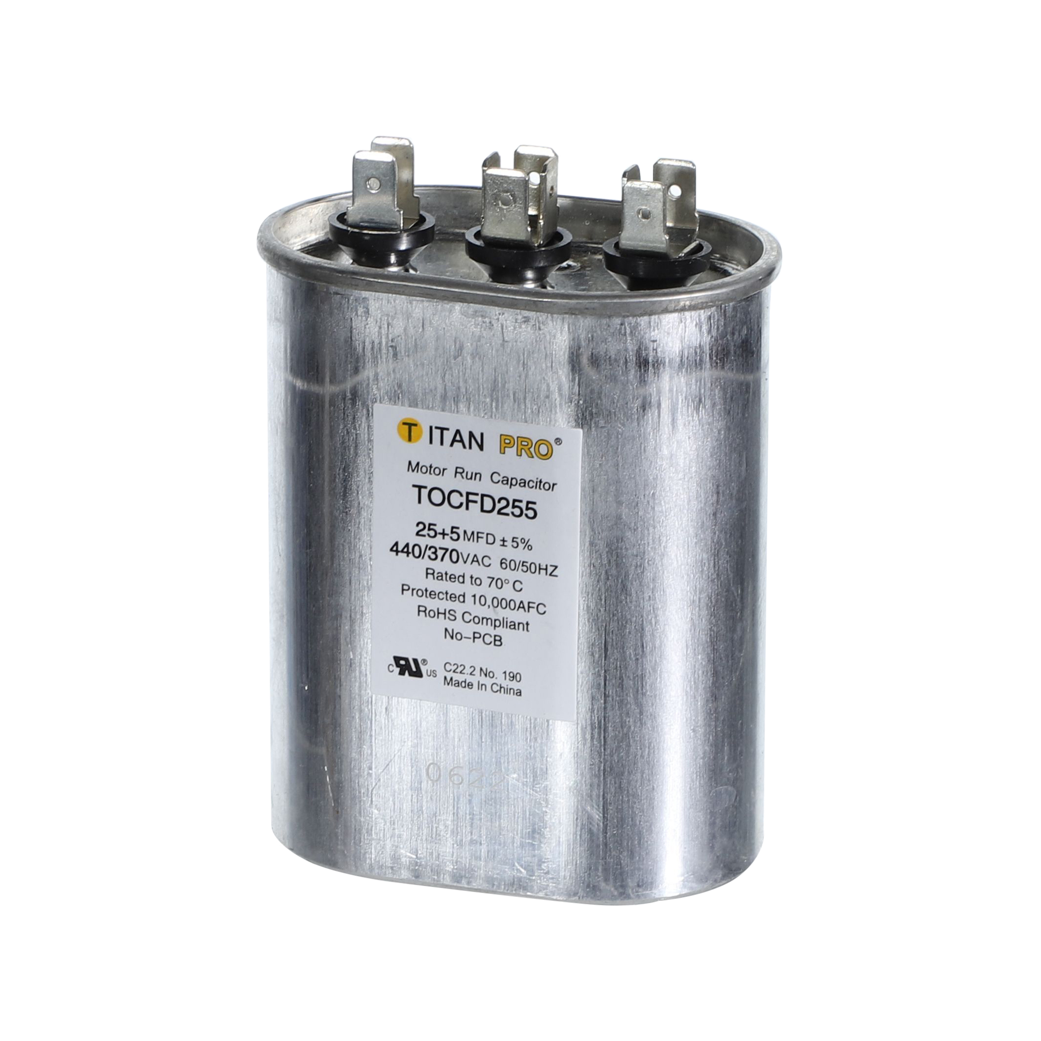 The Packard TOCFD255 is a Titan ProCap 25+5 MFD, 440/370V, Oval Dual Run Capacitor for HVAC motors and compressors. Titan ProCap run capacitors deliver dependable performance for residential and light-commercial HVAC compressor and fan motor applications. Built to exacting quality standards with metalized polypropylene film technology for self-restoration in the event of a breakdown, and a UL-approved pressure-sensitive interrupter for safe end-of-life removal. This dual-rated capacitor houses two capacitance values in a single unit, powering both the compressor and the fan motor simultaneously – simplifying installation and reducing component count. The dual-voltage rating (440/370V) allows this capacitor to replace both 370V and 440V units.