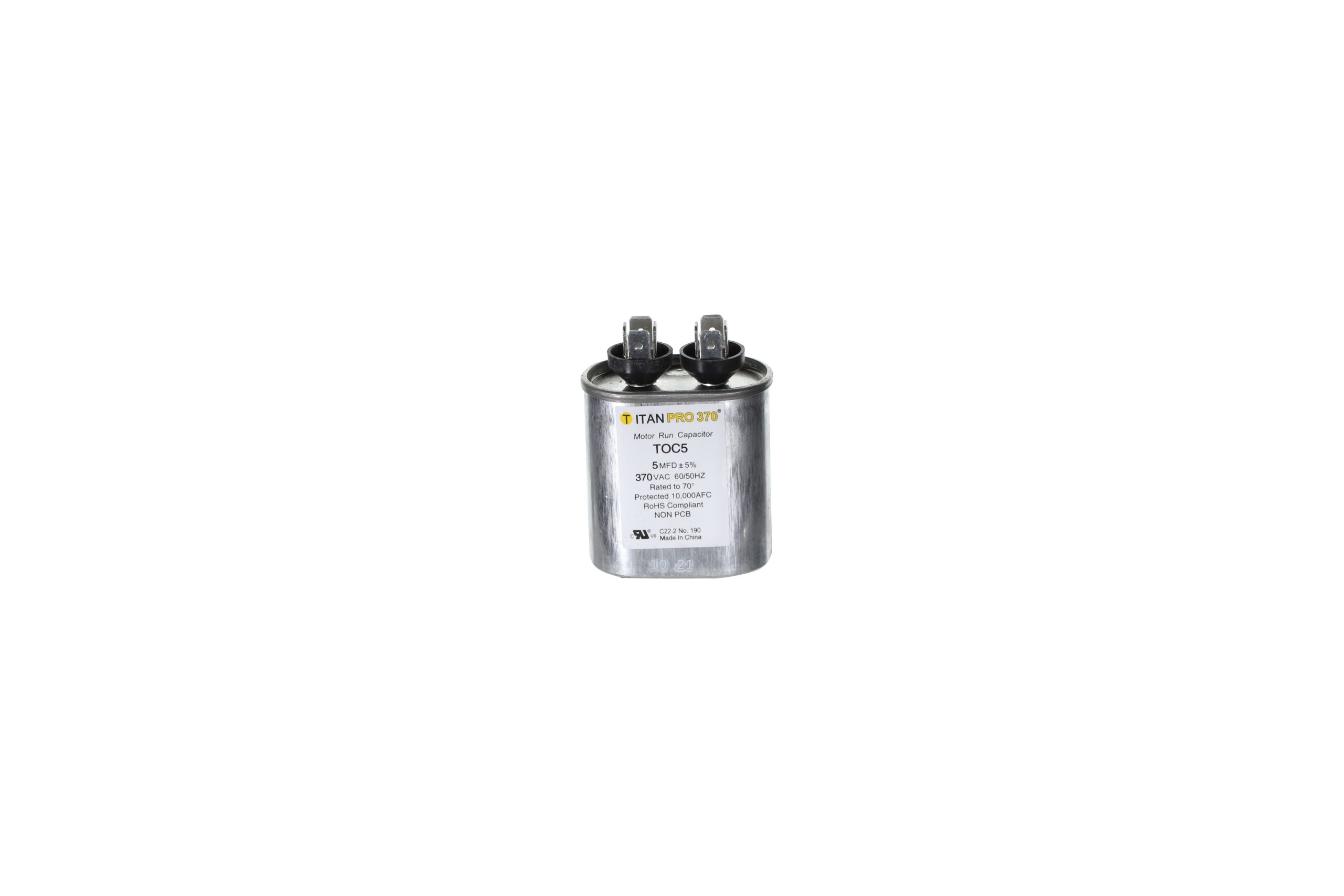 The Packard TOC5 is a Titan ProCap 5 MFD, 370V, Oval Single Run Capacitor for HVAC motors and compressors. Titan ProCap run capacitors deliver dependable performance for residential and light-commercial HVAC compressor and fan motor applications. Built to exacting quality standards with metalized polypropylene film technology for self-restoration in the event of a breakdown, and a UL-approved pressure-sensitive interrupter for safe end-of-life removal.