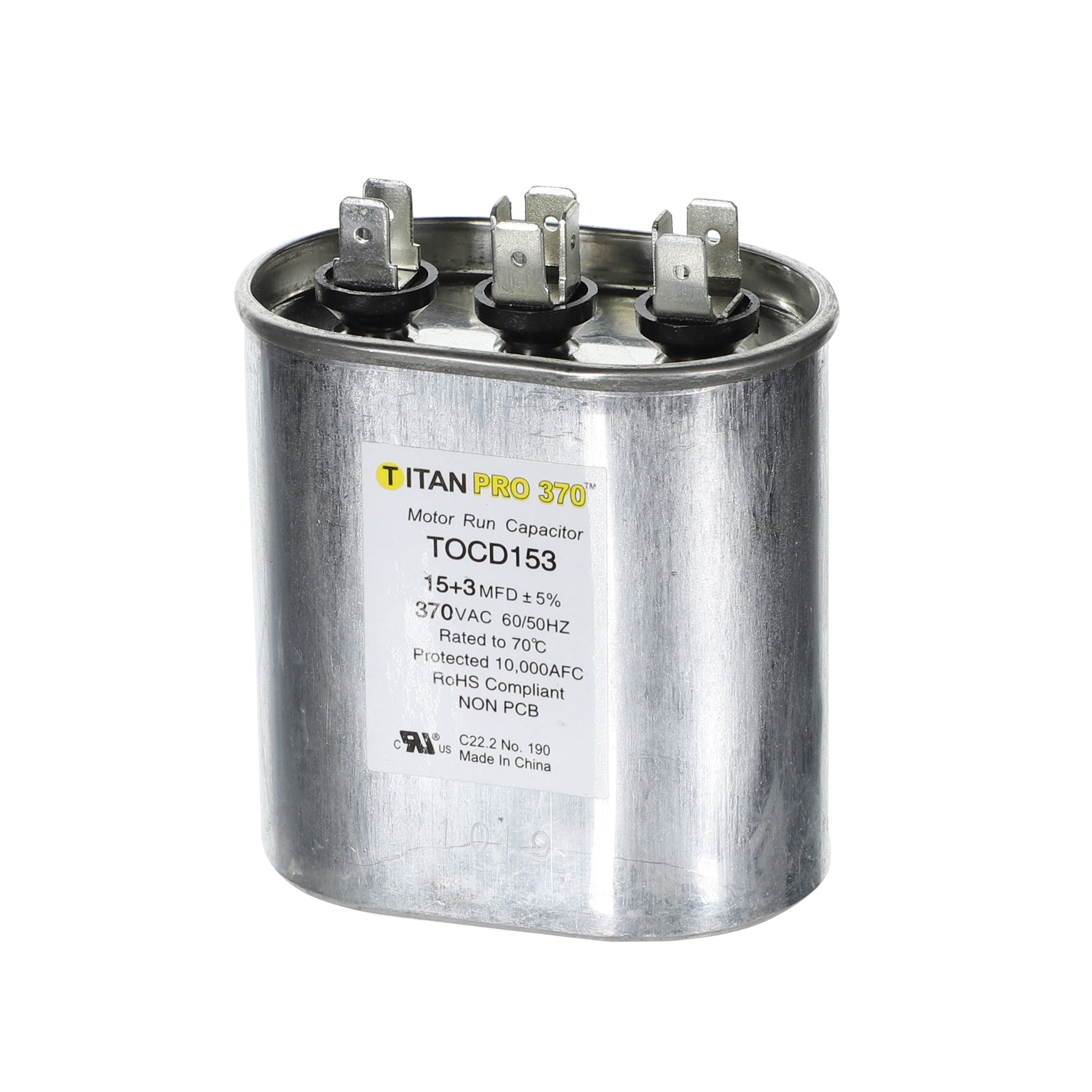 The Packard TOCD153 is a Titan ProCap 15+3 MFD, 370V, Oval Dual Run Capacitor for HVAC motors and compressors. Titan ProCap run capacitors deliver dependable performance for residential and light-commercial HVAC compressor and fan motor applications. Built to exacting quality standards with metalized polypropylene film technology for self-restoration in the event of a breakdown, and a UL-approved pressure-sensitive interrupter for safe end-of-life removal. This dual-rated capacitor houses two capacitance values in a single unit, powering both the compressor and the fan motor simultaneously – simplifying installation and reducing component count.