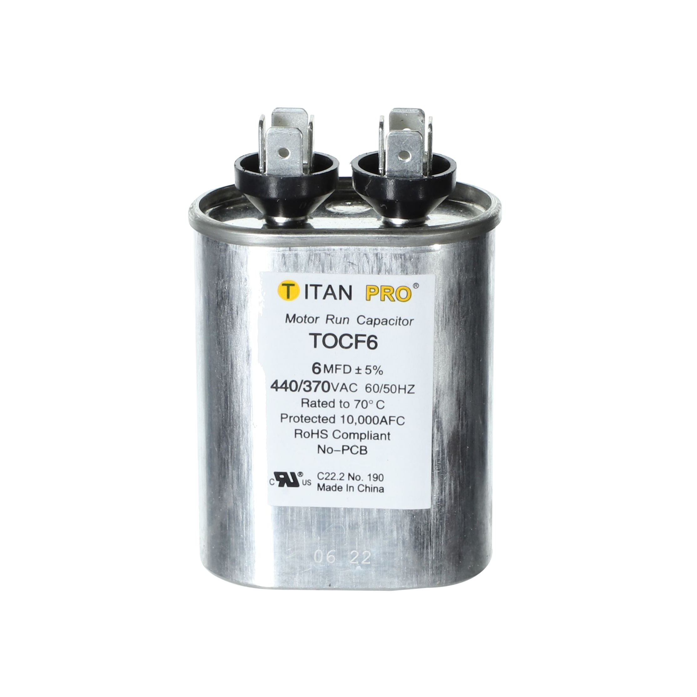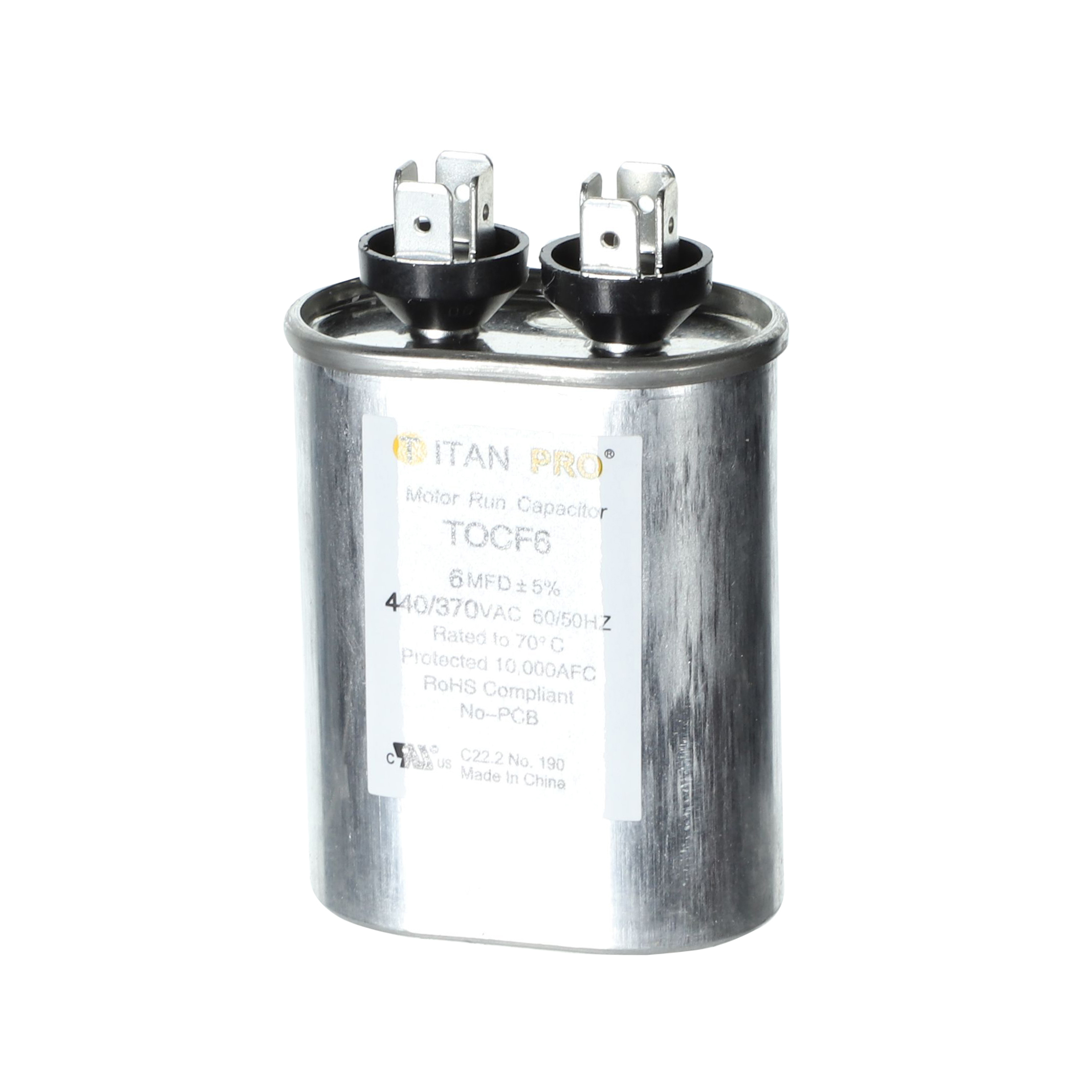 The Packard TOCF6 is a Titan ProCap 6 MFD, 440/370V, Oval Single Run Capacitor for HVAC motors and compressors. Titan ProCap run capacitors deliver dependable performance for residential and light-commercial HVAC compressor and fan motor applications. Built to exacting quality standards with metalized polypropylene film technology for self-restoration in the event of a breakdown, and a UL-approved pressure-sensitive interrupter for safe end-of-life removal. The dual-voltage rating (440/370V) allows this capacitor to replace both 370V and 440V units.