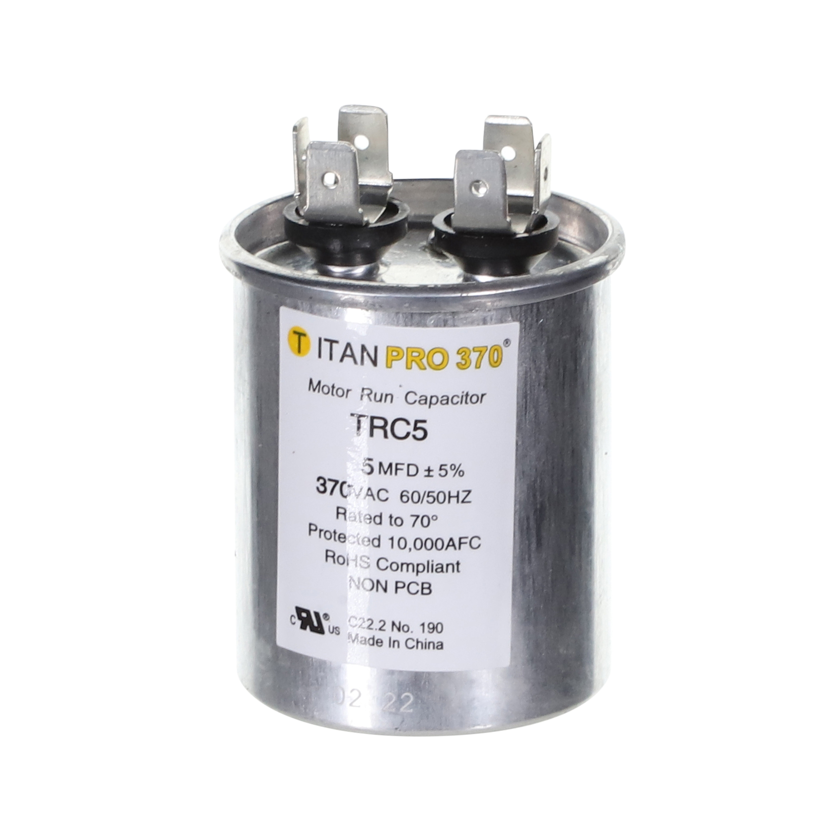 The Packard TRC5 is a Titan ProCap 5 MFD, 370V, Round Single Run Capacitor for HVAC motors and compressors. Titan ProCap run capacitors deliver dependable performance for residential and light-commercial HVAC compressor and fan motor applications. Built to exacting quality standards with metalized polypropylene film technology for self-restoration in the event of a breakdown, and a UL-approved pressure-sensitive interrupter for safe end-of-life removal.