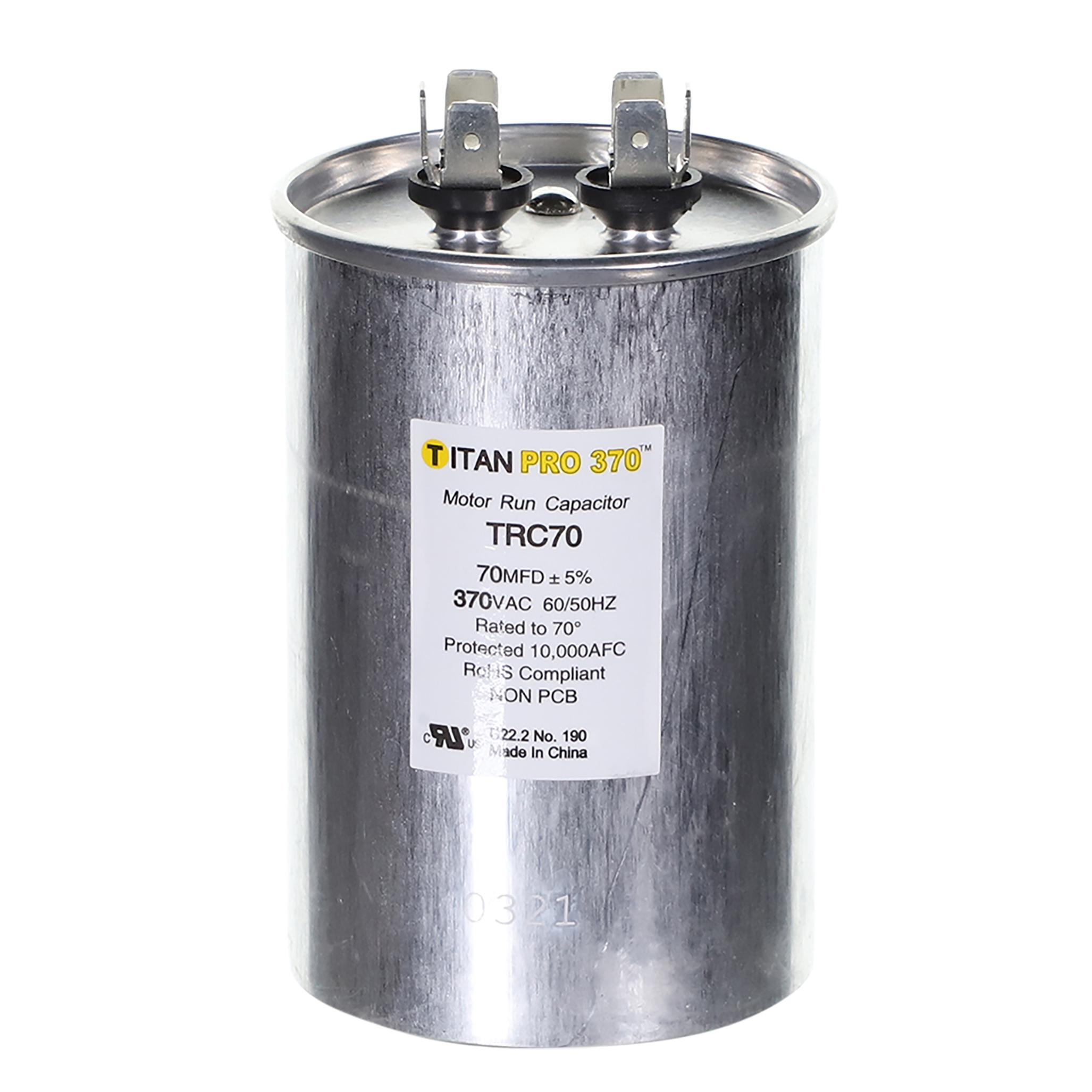 The Packard TRC70 is a Titan ProCap 70 MFD, 370V, Round Single Run Capacitor for HVAC motors and compressors. Titan ProCap run capacitors deliver dependable performance for residential and light-commercial HVAC compressor and fan motor applications. Built to exacting quality standards with metalized polypropylene film technology for self-restoration in the event of a breakdown, and a UL-approved pressure-sensitive interrupter for safe end-of-life removal.
