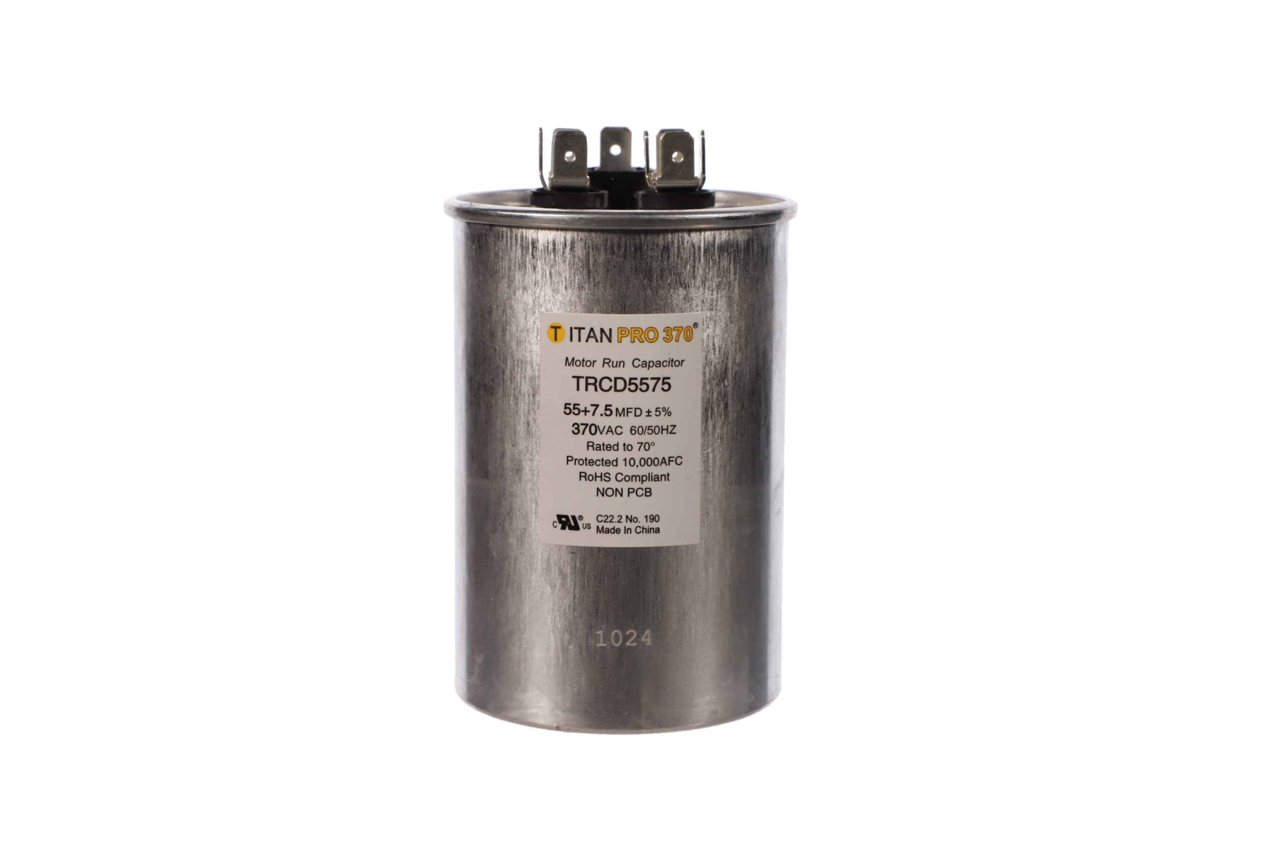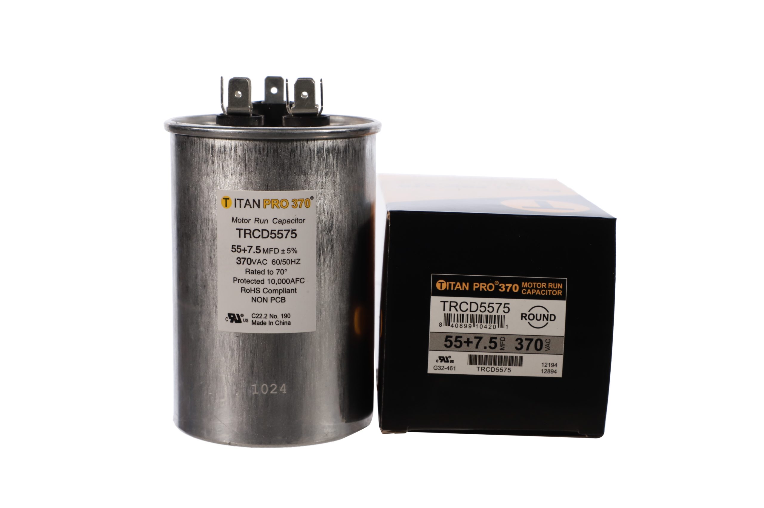 The Packard TRCD5575 is a Titan ProCap 55+7.5 MFD, 370V, Round Dual Run Capacitor for HVAC motors and compressors. Titan ProCap run capacitors deliver dependable performance for residential and light-commercial HVAC compressor and fan motor applications. Built to exacting quality standards with metalized polypropylene film technology for self-restoration in the event of a breakdown, and a UL-approved pressure-sensitive interrupter for safe end-of-life removal. This dual-rated capacitor houses two capacitance values in a single unit, powering both the compressor and the fan motor simultaneously – simplifying installation and reducing component count.