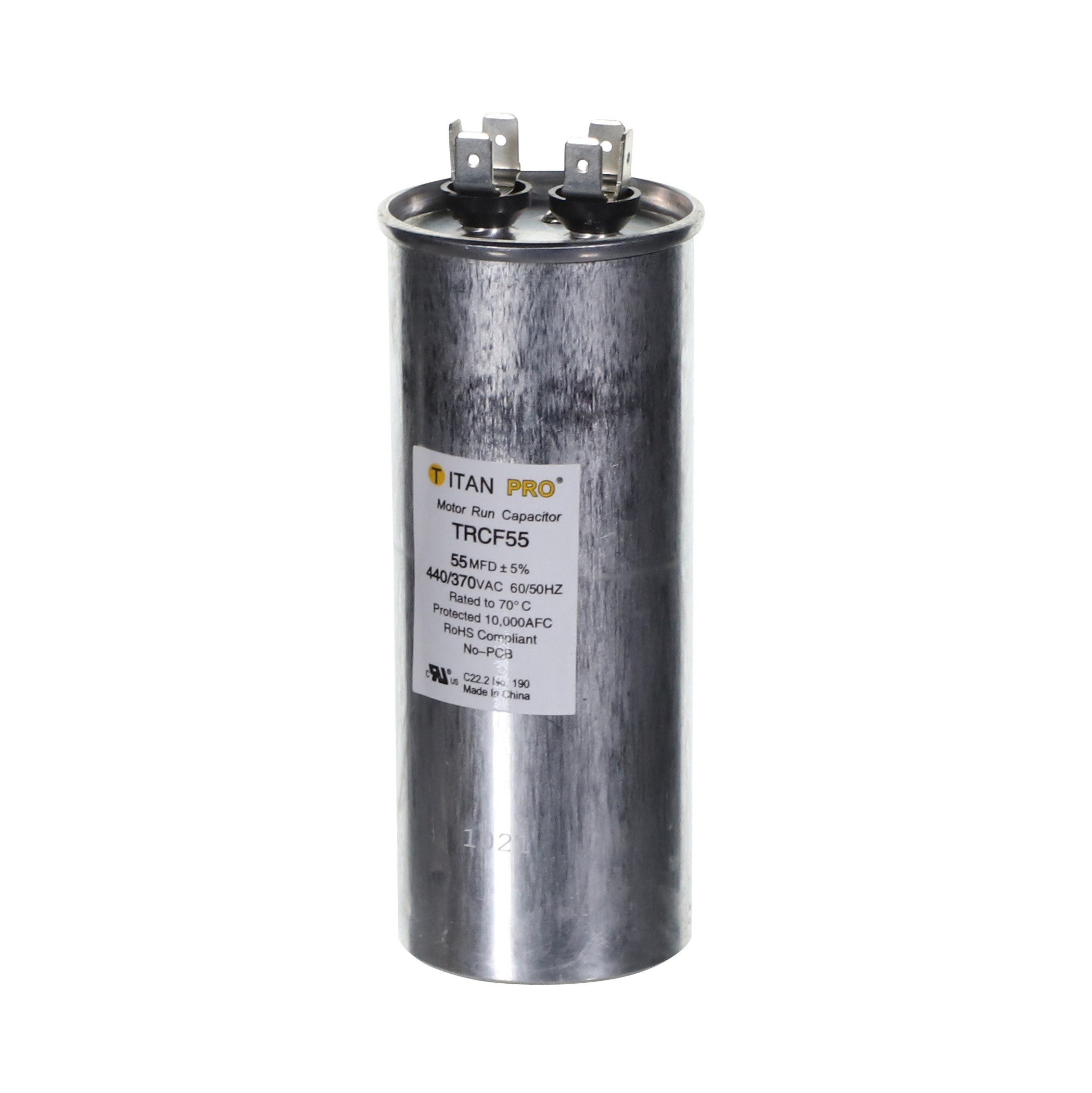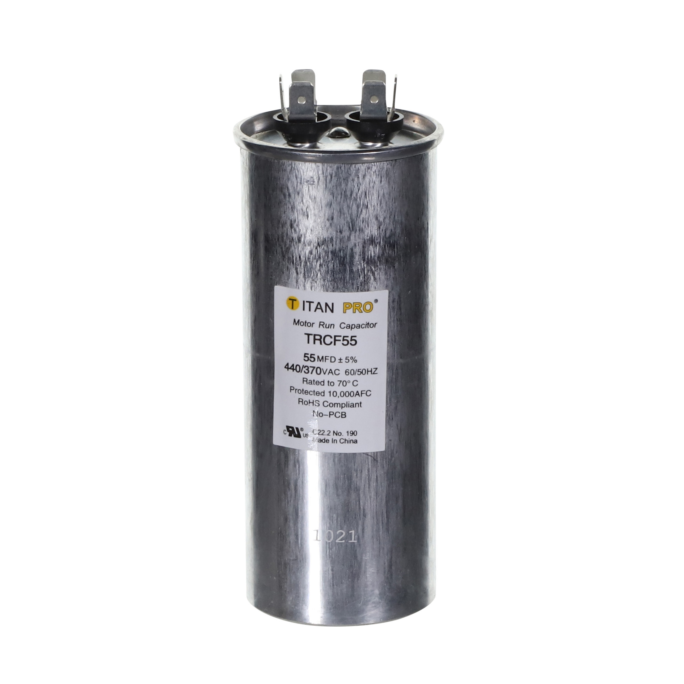 The Packard TRCF55 is a Titan ProCap 55 MFD, 440/370V, Round Single Run Capacitor for HVAC motors and compressors. Titan ProCap run capacitors deliver dependable performance for residential and light-commercial HVAC compressor and fan motor applications. Built to exacting quality standards with metalized polypropylene film technology for self-restoration in the event of a breakdown, and a UL-approved pressure-sensitive interrupter for safe end-of-life removal. The dual-voltage rating (440/370V) allows this capacitor to replace both 370V and 440V units.