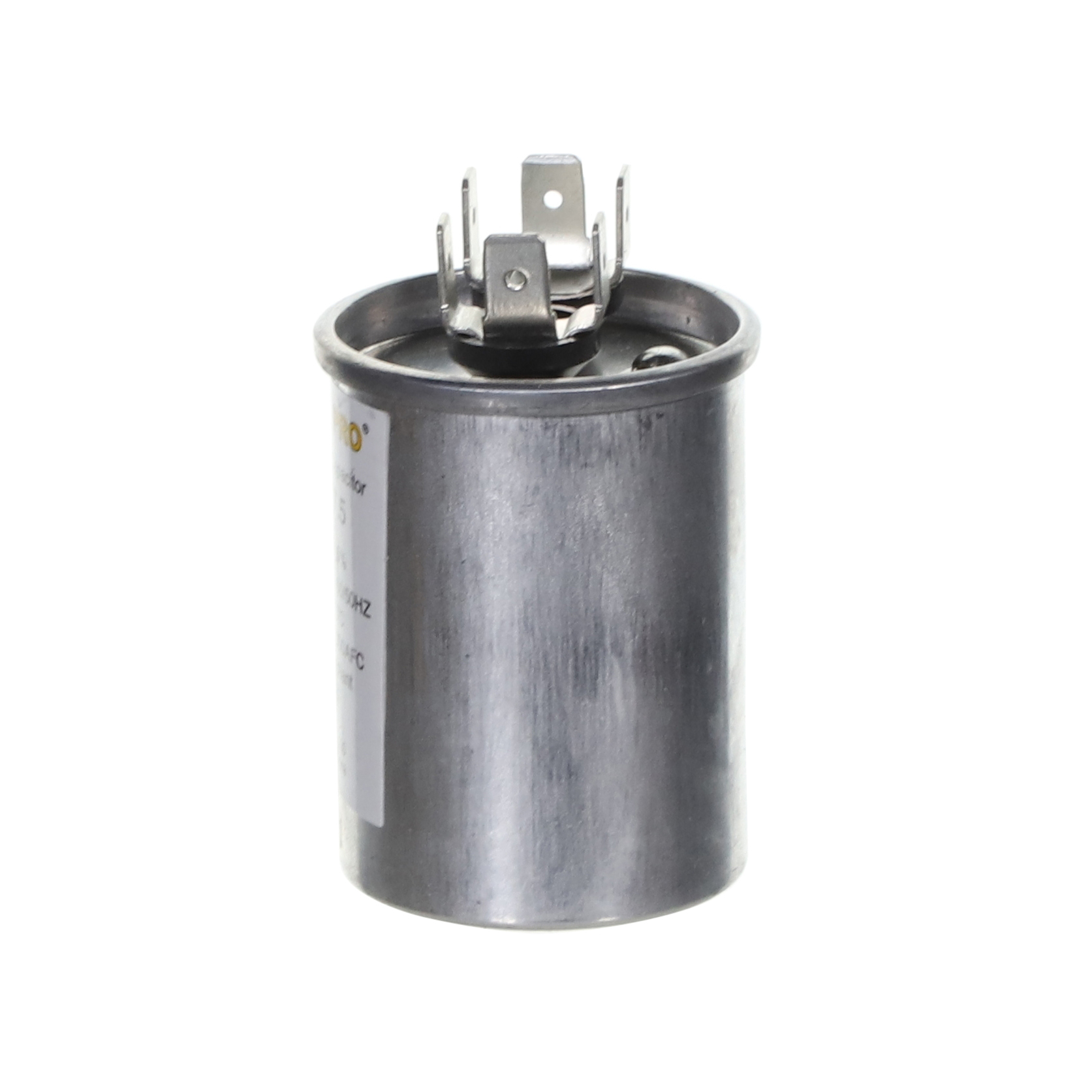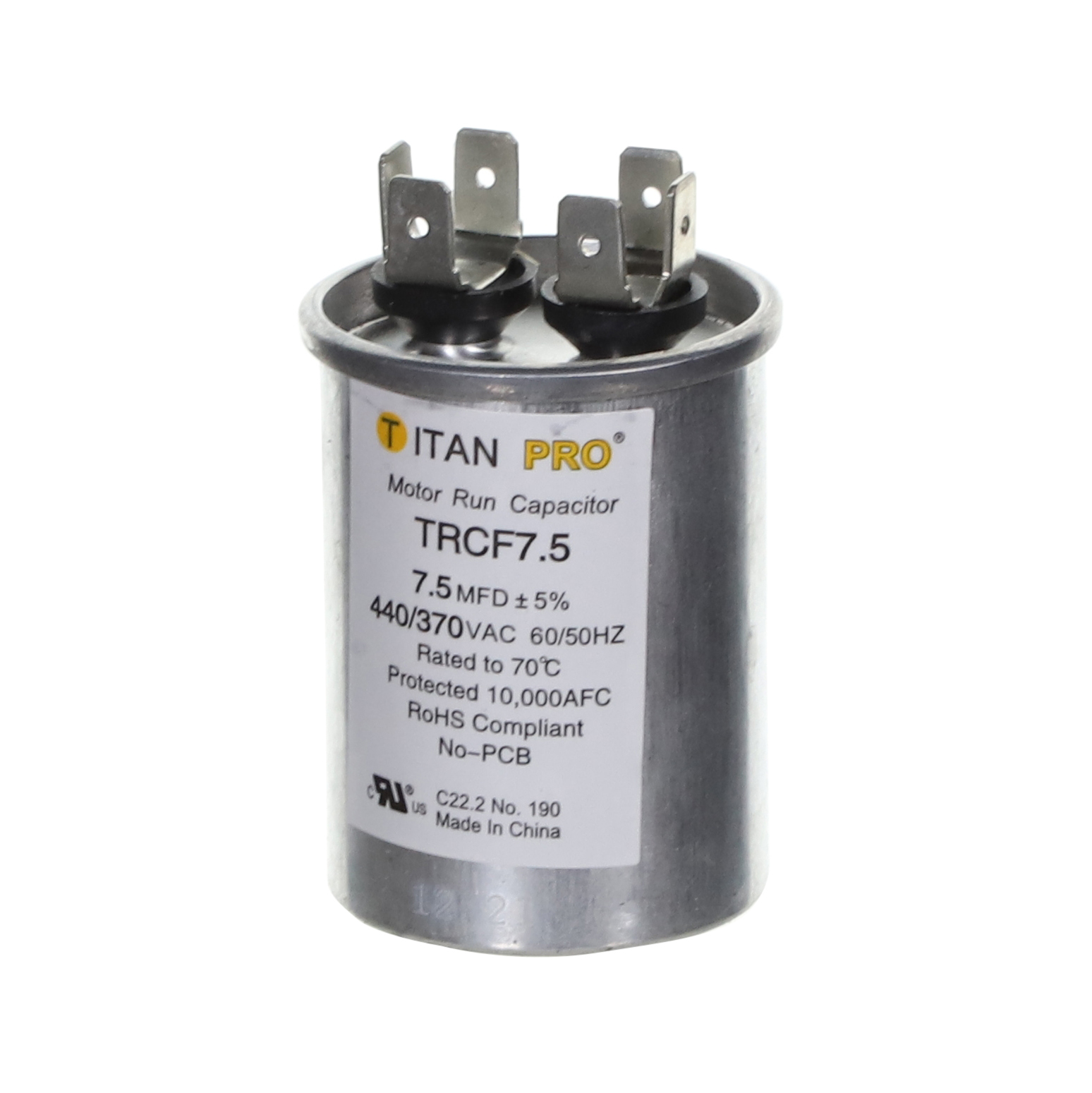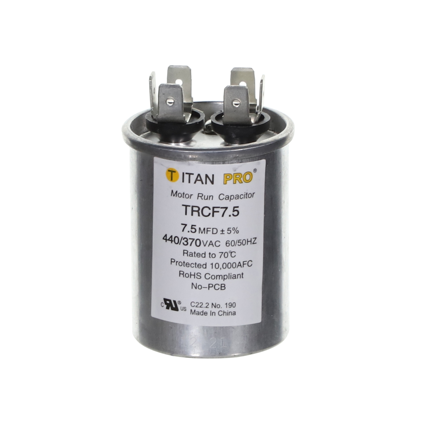 The Packard TRCF7.5 is a Titan ProCap 7.5 MFD, 440/370V, Round Single Run Capacitor for HVAC motors and compressors. Titan ProCap run capacitors deliver dependable performance for residential and light-commercial HVAC compressor and fan motor applications. Built to exacting quality standards with metalized polypropylene film technology for self-restoration in the event of a breakdown, and a UL-approved pressure-sensitive interrupter for safe end-of-life removal. The dual-voltage rating (440/370V) allows this capacitor to replace both 370V and 440V units.