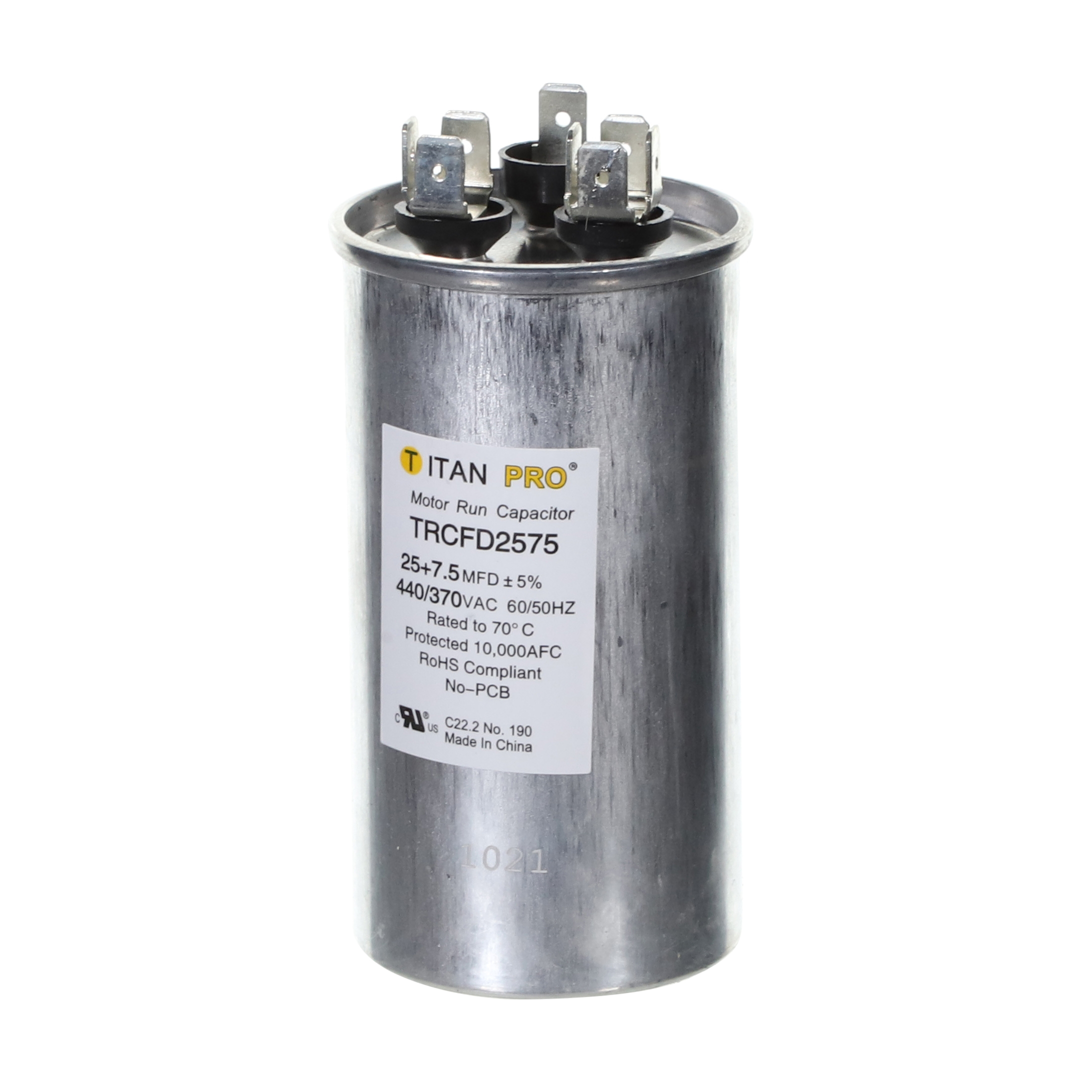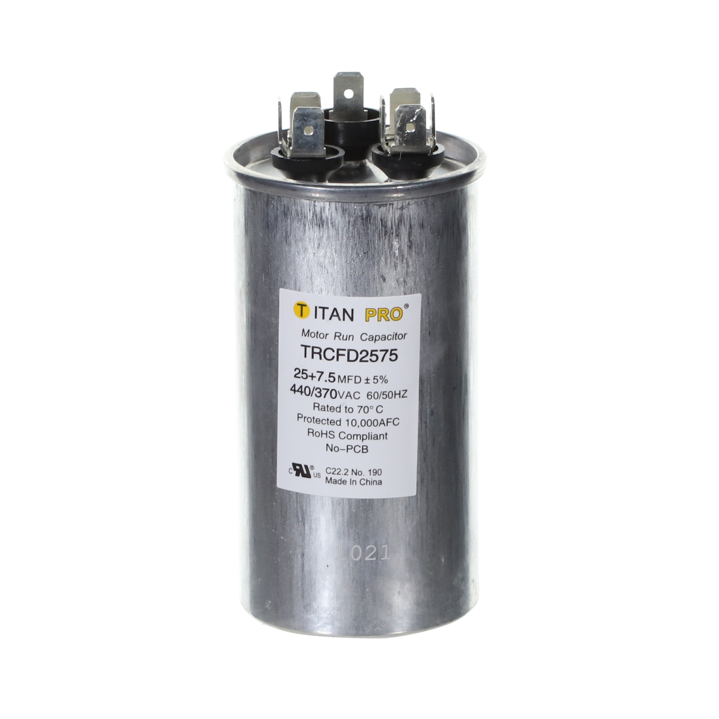 The Packard TRCFD2575 is a Titan ProCap 25+7.5 MFD, 440/370V, Round Dual Run Capacitor for HVAC motors and compressors. Titan ProCap run capacitors deliver dependable performance for residential and light-commercial HVAC compressor and fan motor applications. Built to exacting quality standards with metalized polypropylene film technology for self-restoration in the event of a breakdown, and a UL-approved pressure-sensitive interrupter for safe end-of-life removal. This dual-rated capacitor houses two capacitance values in a single unit, powering both the compressor and the fan motor simultaneously – simplifying installation and reducing component count. The dual-voltage rating (440/370V) allows this capacitor to replace both 370V and 440V units.