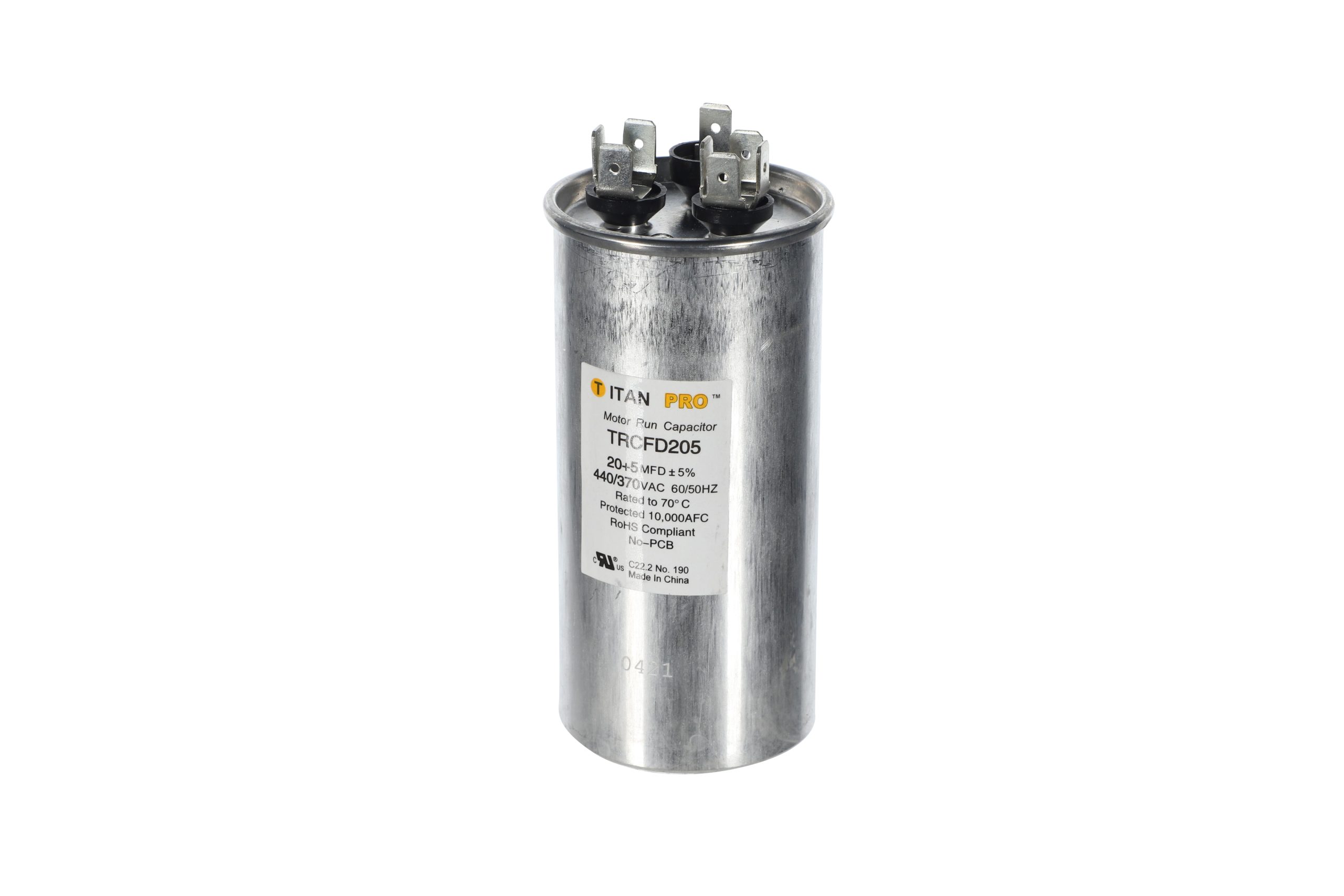 The Packard TRCFD6010 is a Titan ProCap 60+10 MFD, 440/370V, Round Dual Run Capacitor for HVAC motors and compressors. Titan ProCap run capacitors deliver dependable performance for residential and light-commercial HVAC compressor and fan motor applications. Built to exacting quality standards with metalized polypropylene film technology for self-restoration in the event of a breakdown, and a UL-approved pressure-sensitive interrupter for safe end-of-life removal. This dual-rated capacitor houses two capacitance values in a single unit, powering both the compressor and the fan motor simultaneously – simplifying installation and reducing component count. The dual-voltage rating (440/370V) allows this capacitor to replace both 370V and 440V units.