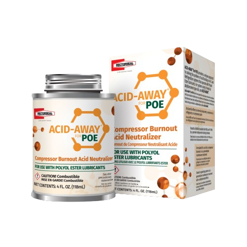 Prevent compressor burnout and protect your HVAC or refrigeration system with Acid-Away for POE Oil, a specialized acid-neutralizing treatment specifically formulated for Polyol Ester (POE)–based refrigeration oils. This compact 4 oz bottle eliminates residual acid build-up—without requiring aggressive solvent flushing or repeated oil changes.