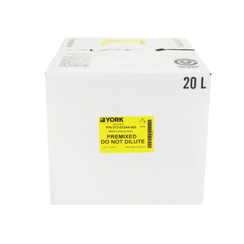 The York 013 03344 000 is an OEM grade glycol coolant designed for HVAC, chiller, and refrigeration systems. Pre mixed and ready to use, this 5 gallon coolant solution delivers effective freeze protection, reliable heat exchange, and long-term corrosion resistance — making it a go-to choice for maintenance and system service.